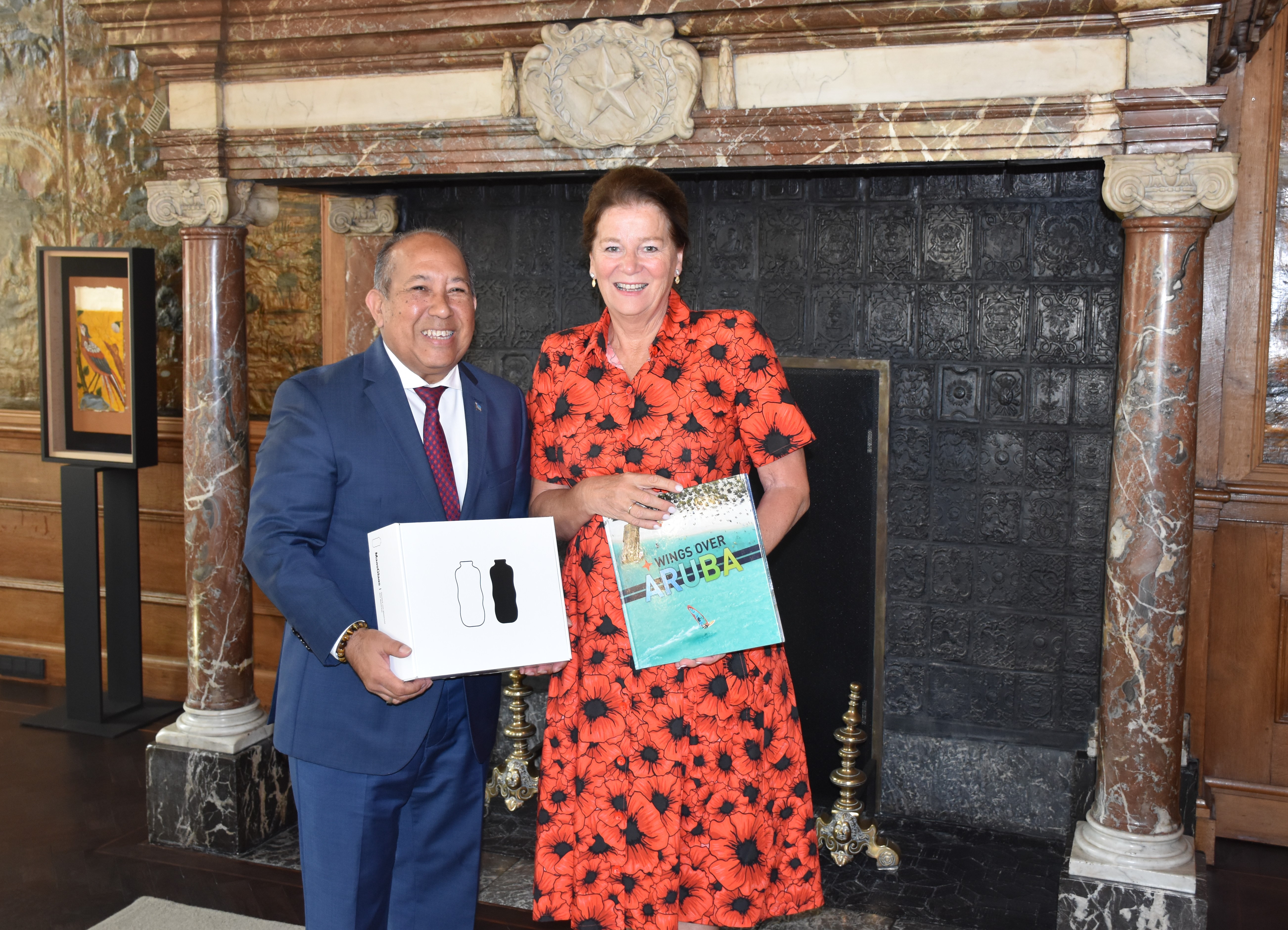 ORANJESTAD (AAN)/Den Haag: Minister Plenipotenciario Suplente mr. Ady Thijsen a reuni cu burgemeester di Maastricht mr. Annemarie Penn-te Strakke. Sr. Thijsen durante e combersacion a bisa cu su plan como minister ta pa bishita e municipionan (gemeente) grandi di Hulanda y cu e ta mira un significacion grandi pa estrecha e lasonan entre Aruba y e municipionan. Segun sr. Thijsen como meta pa Aruba ta visible pa un y tur na Hulanda.