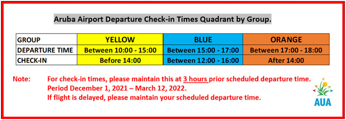 E Passenger Flow Control ta pa preveni cu pasaheronan ta yega (mucho) trempan na AUA Airport pa check-in. Esaki lo keda vigente durante e periodo di Winter cuminsando 1 di December 2021 te cu 12 di Maart 2022.