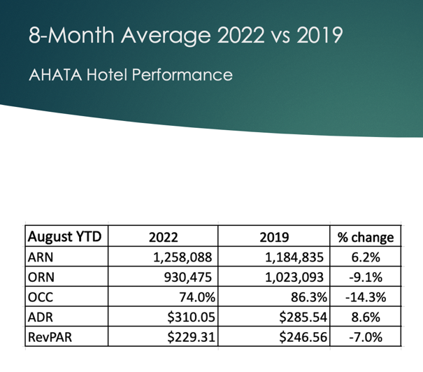 ORANJESTAD (AAN): Aruba Hotel & Tourism Association (AHATA) ta raporta cu na luna di Augustus hotelnan a logra bon recuperacion, pero e entrada di prome 8 luna di 2022 ainda no a yega nivel di 2019.