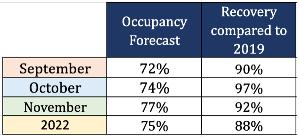Ta proyecta un recuperacion di 90% pa ocupacion di luna di September y expectativa pa ful aña 2022 ta un recuperacion di 88% compara cu ocupacion di 2019.