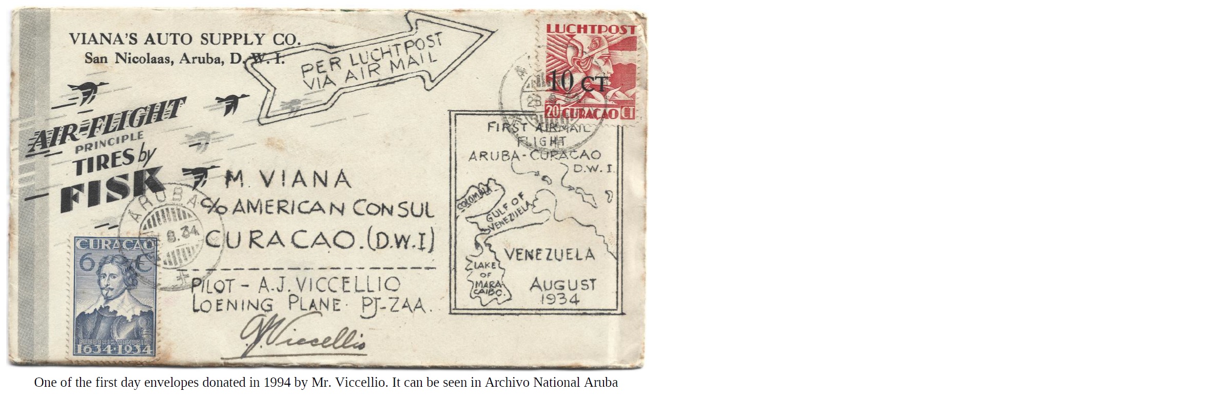Riba 28 di augustus 1934 a tuma lugar e prome vuelo comercial pa Corsou y na e ocasion ey tabata tin e envelopnan di prome edicion cu a wordo manda Corsou, cu awor Archivo Nacional Aruba a haya un di nan.