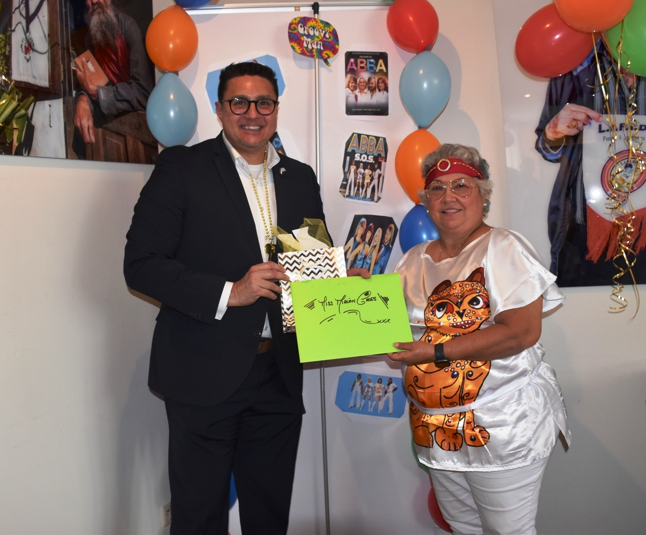 Despues di e parti aki a pasa over pa entregamento di regaldo. Minister Besaril a haci entrega di e regaldo di e personal di Arubahuis y Shandra John a duna Miriam un regalo personal como aprecio.