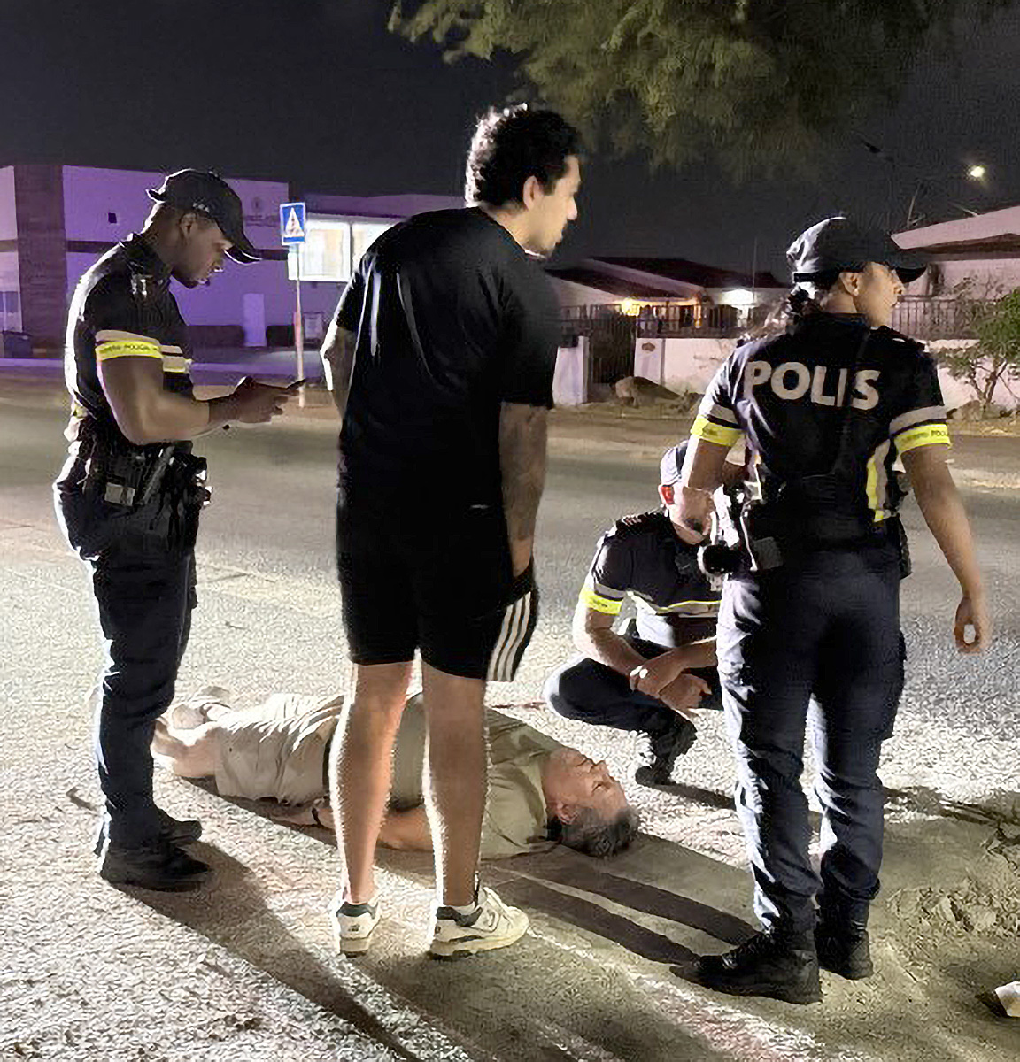 Esnan cu a yama Polis a splica cu nan ta testigo con auto a dal e peaton crusando caya, y el a keda eybao benta. Nan a stop y pa evita mas tragedia, nan a lastra e homber for di riba asfalt y a pone na banda riba acera, y warda asina riba Polis y Ambulance.