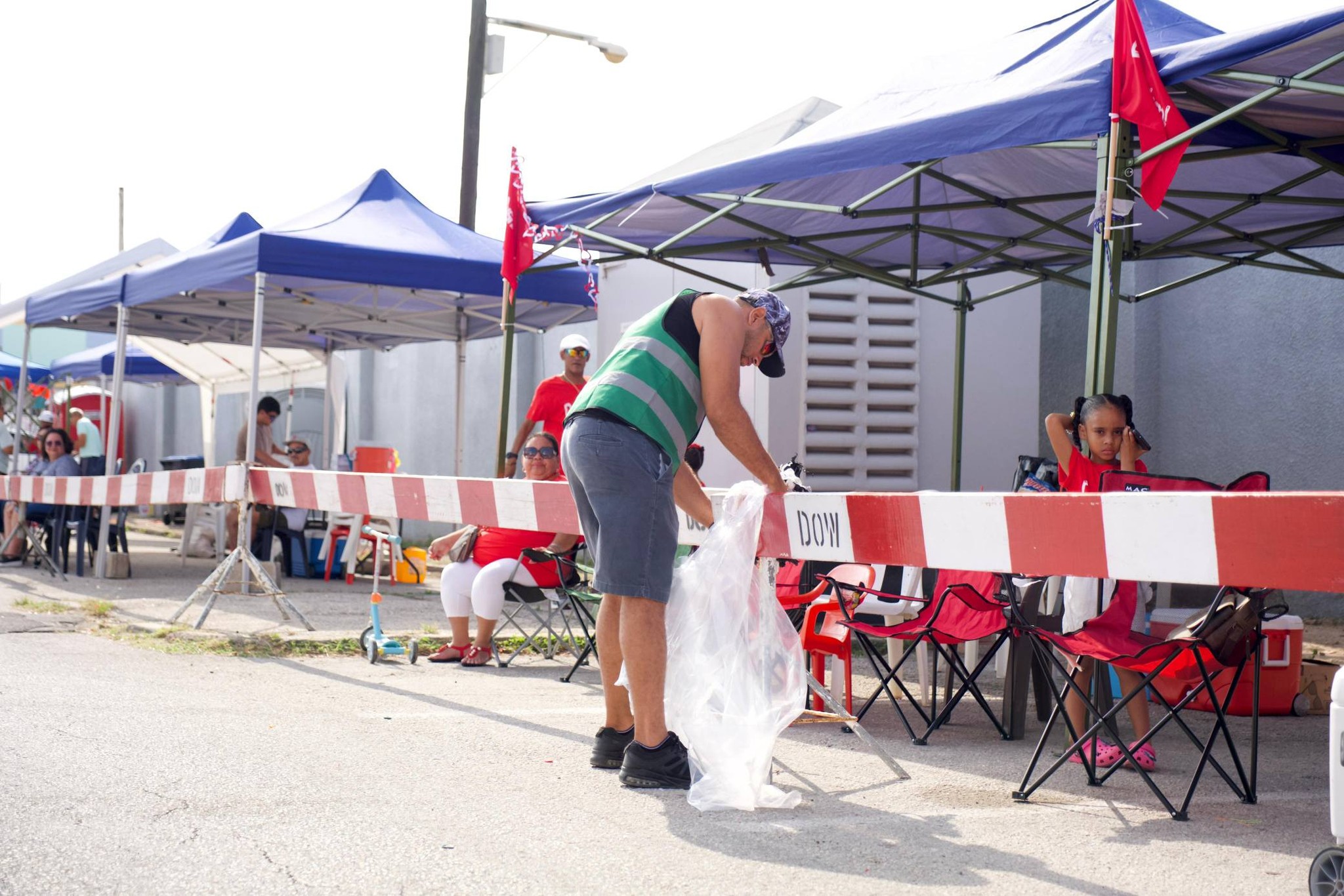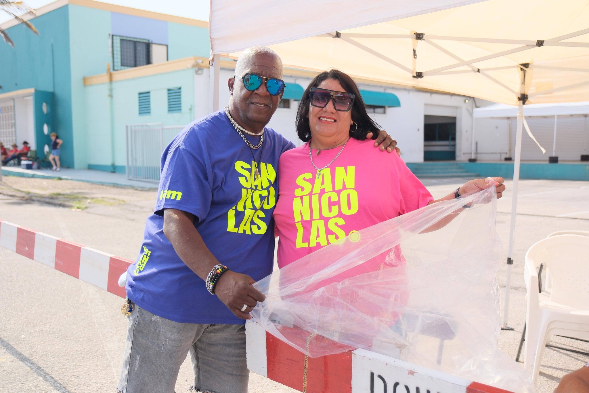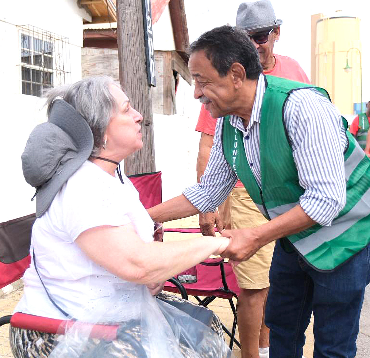 Riba Diasabra cu e Parada Grandi na San Nicolas, un team di AVP a subi caya acompaña pa Ministro Rene Herdé, pa asina reparti saco a lo largo di e ruta. Nan ta topa cu mirones na banda, cu ta acepta e saconan cu man habri. Areanan cu no tin hende ainda, nan tabata mara e saconan aki na e baricadanan pa asina suministra un espacio pa benta sushi afo.