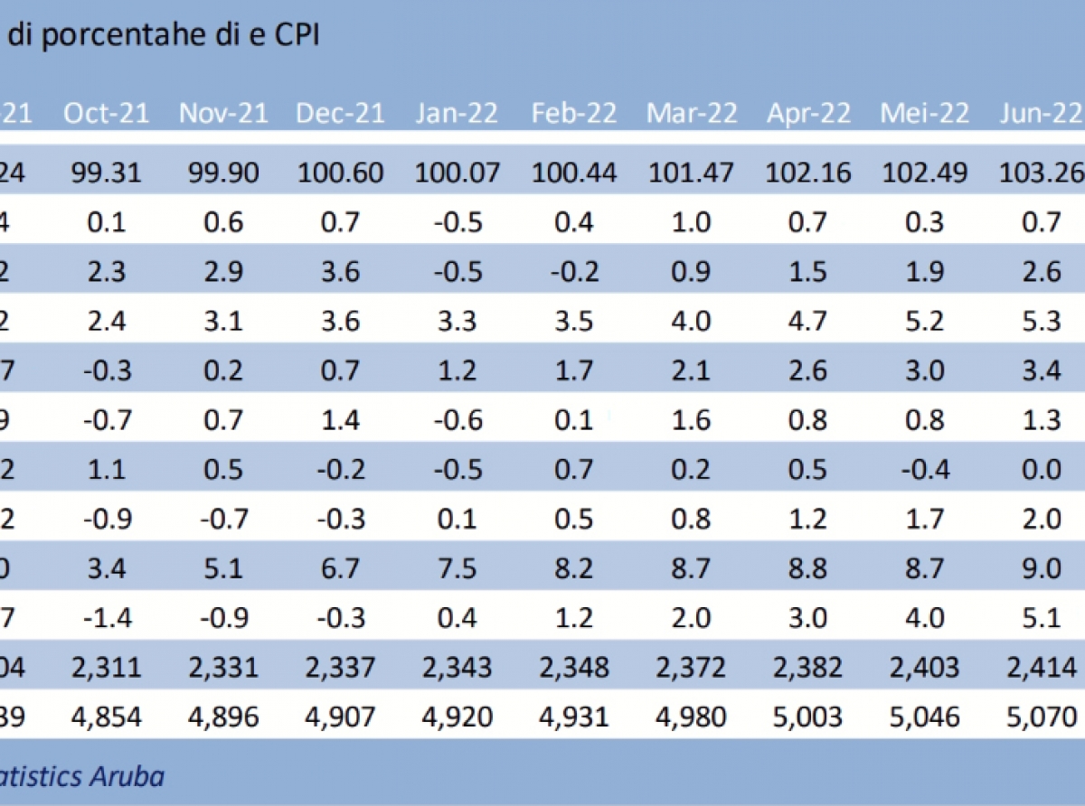 E cambio di e CPI pa e ultimo diesdos (12) lunanan (September 2021 te cu September 2022) ta 7.0%, un subida di 4.8 punto di porcentahe (ppt) compara cu e periodo corespondiente di aña pasa (2.2%). E promedio anual (ultimo 24 luna) di e tasa di inflacion pa e periodonan di September 2020 te cu September 2021 y September 2021 te cu September 2022 ta 4.7%, un subida di 5.4 ppt compara cu e -0.7% registra den e periodonan di September 2019 te cu September 2020 y September 2020 te cu September 2021.