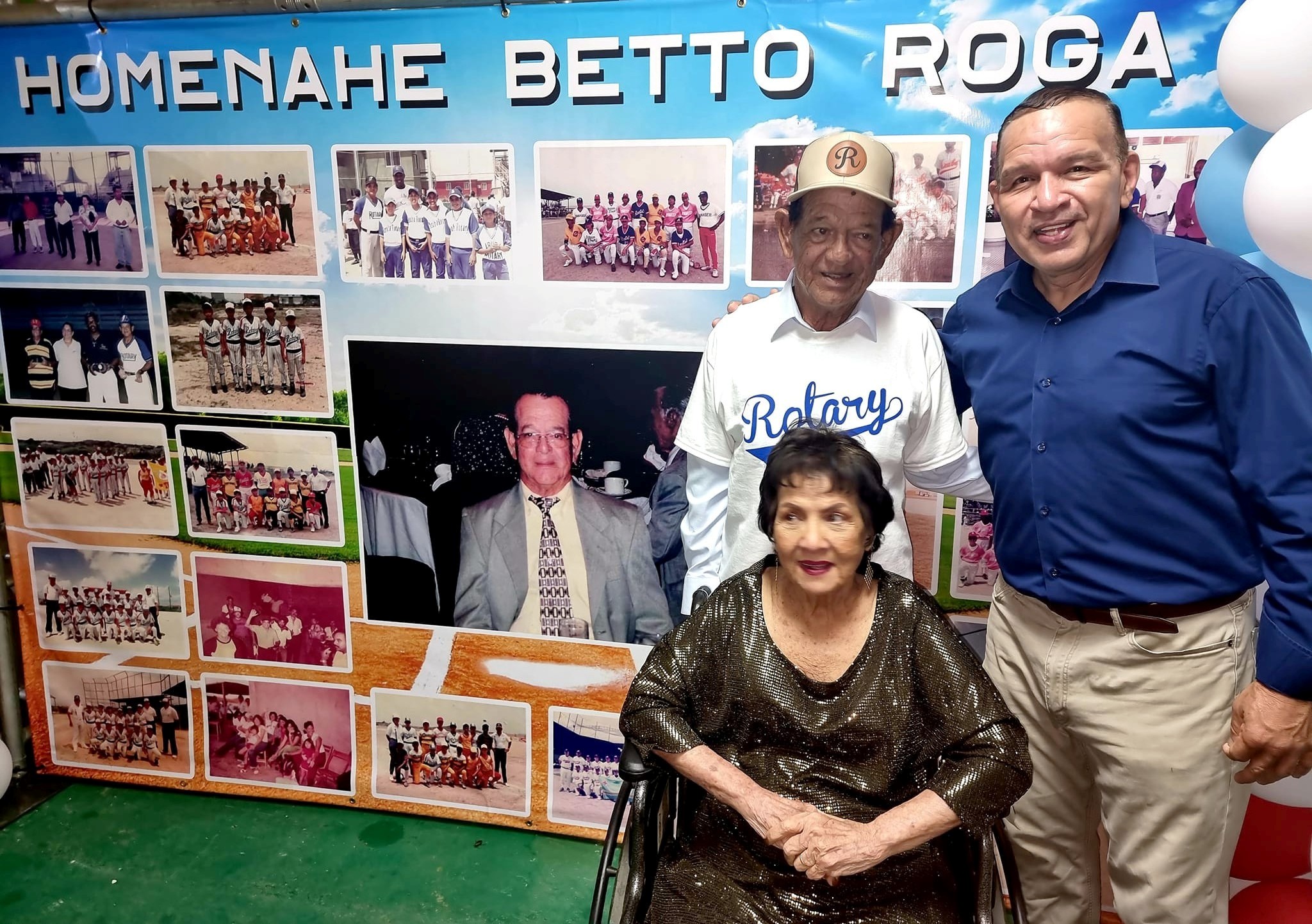 Den presencia di su esposa, yiunan, amistadnan y ex hungadonan di baseball e mandatario di deporte a haci entrega di e reconocemento di ‘Baluarte di Deporte’ na e legendario sr. Betto Roga. Minister di Enseñansa y Deporte Endy Croes ta gradici Betto pa su dedicacion y aporte den deporte di baseball na Aruba.
