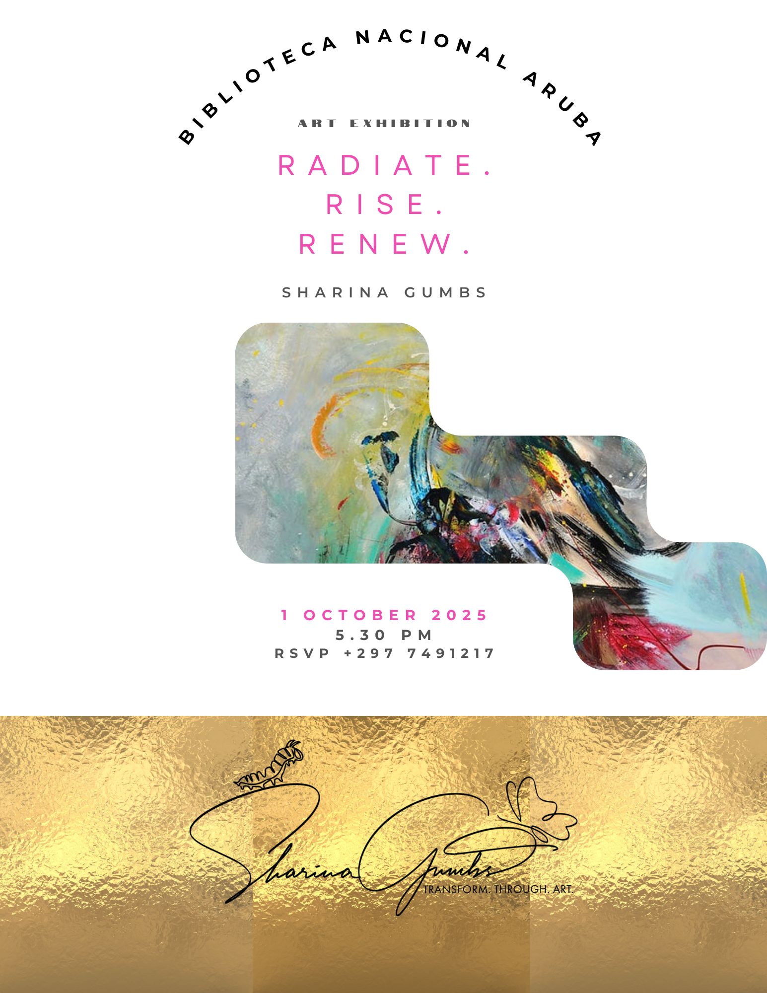 Titulo di e exposicion ta ‘Radiate. Rise. Renew.’. E exposicion ta ofrece un biahe den desaroyo di artista Sharina Gumbs y e ta un combinacion di obranan di diferente periodo, experimento, obranan nobo y ta duna un bista di e diferente experencianan di bida. Tur hende ta pasa den bon y den malo. Central den e exposicion ta, e celebracion di e bida di Sharina su mama y su amor. E amor cu ta un bunita herencia cu ta sigui guia e artista.