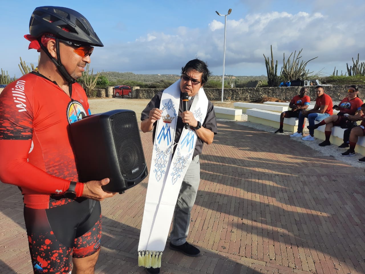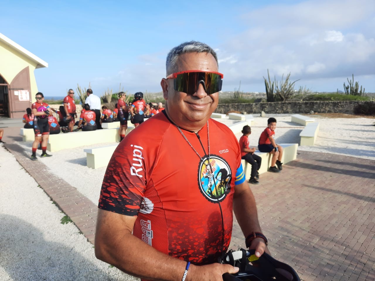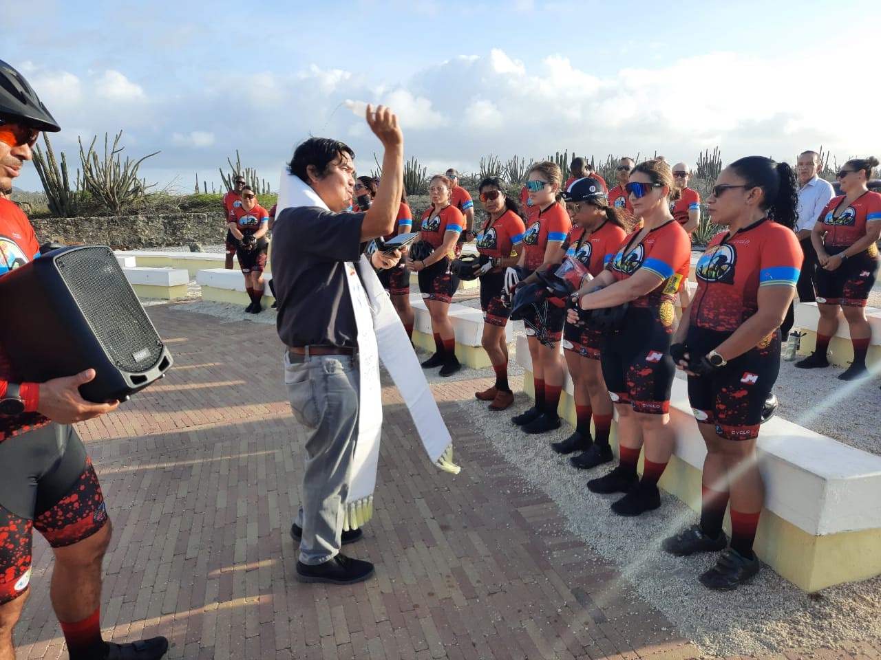 Pastor Toti Fuentebella kende ta forma parti di e ekipo di Aruba Biking Squad hunto cu e Mandatario di Deporte a haci acto di bautismo di e uniform cu e ekipo lo ta estrenando riba caminda y den competencianan di ‘mountain bike’.