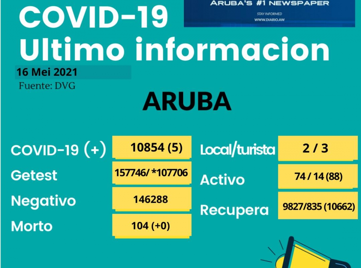 ORANJESTAD (AAN): Crisis Team a informa diadomingo cu 13 persona a recupera, mientras cu a registra un total di 5 caso nobo di Covid-19, di cual 3 ta no-residente.