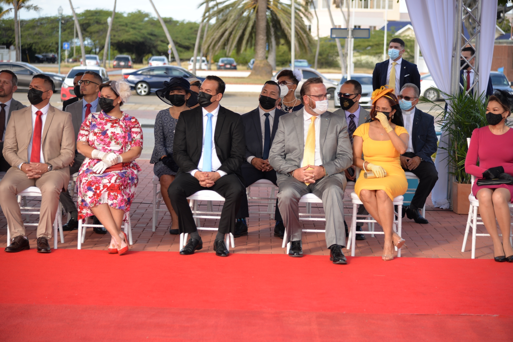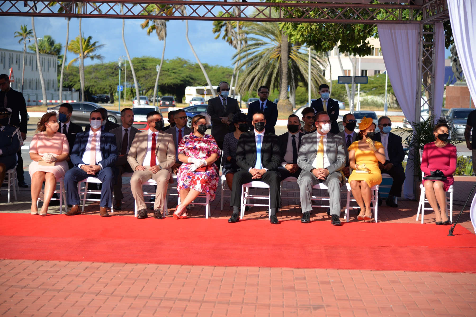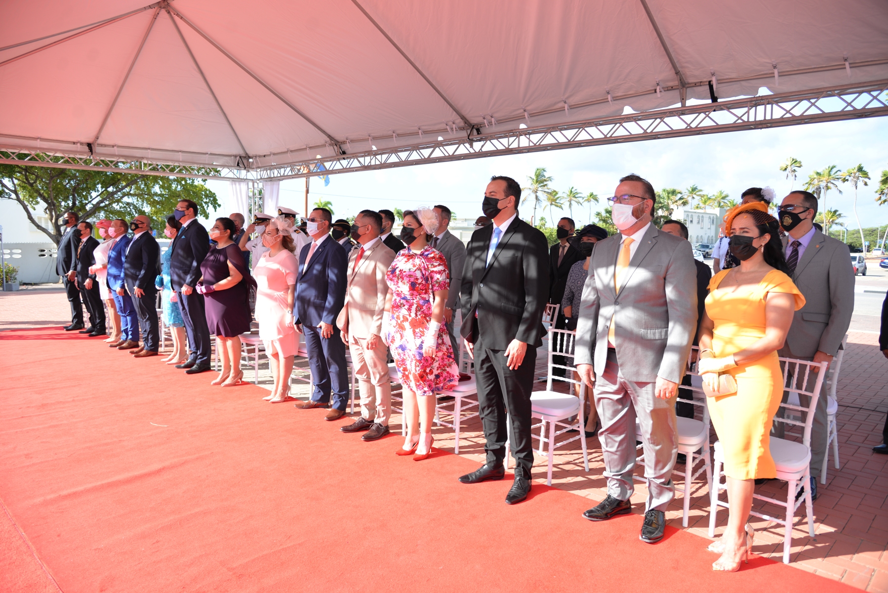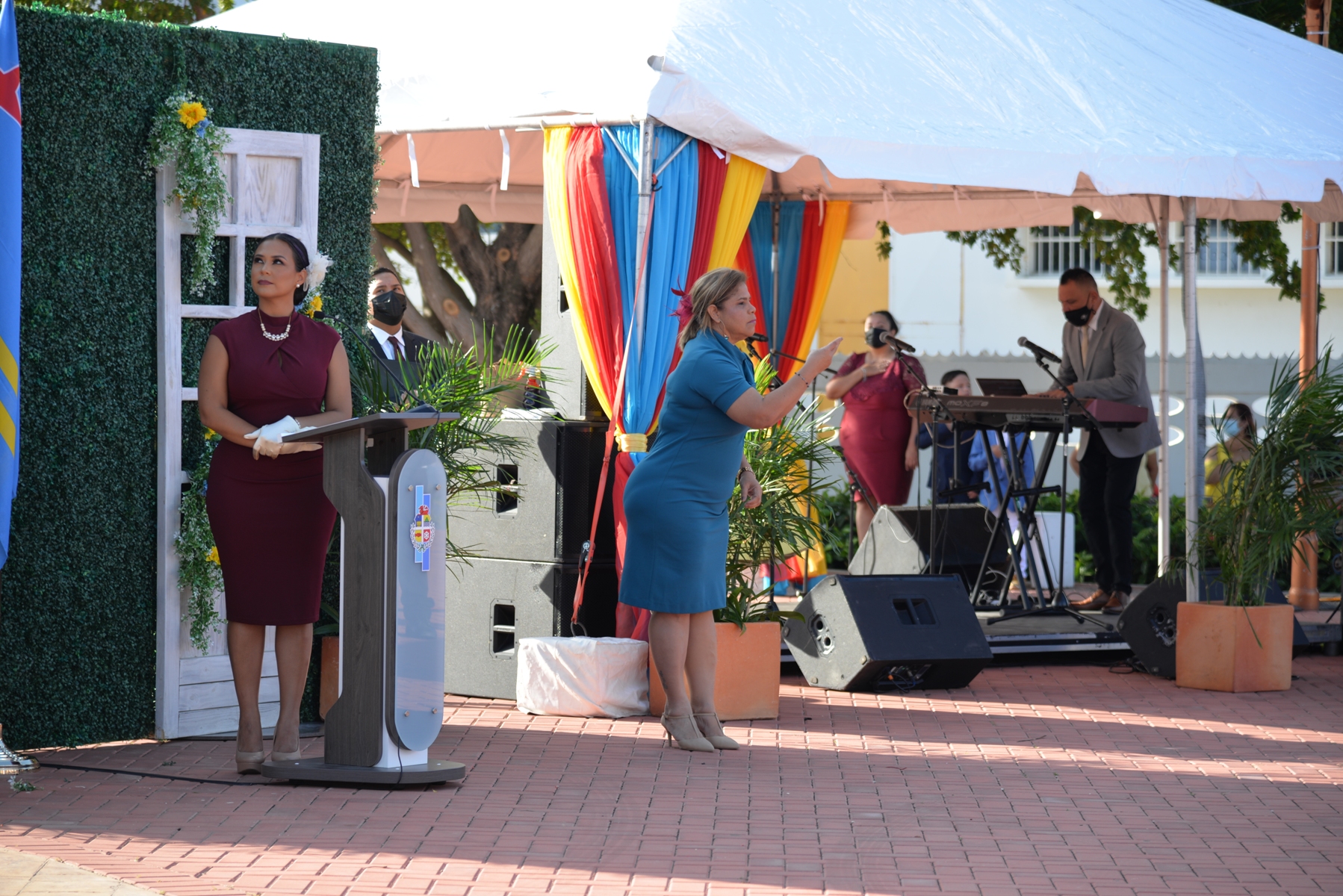 Despues di e yegada di Minister, Parlamentarionan, y otro funcionarionan di gobierno, a ricibi Gobernador Alfonso Boekhoudt y su distinguido Esposa, y e acto a cuminza cu entonacion di Himno Nacional Aruba Dushi Tera, interpreta pa e dos hobencitanan Angelina Leon y Lisienn Web, dirigi pa señor Danny Koolman.