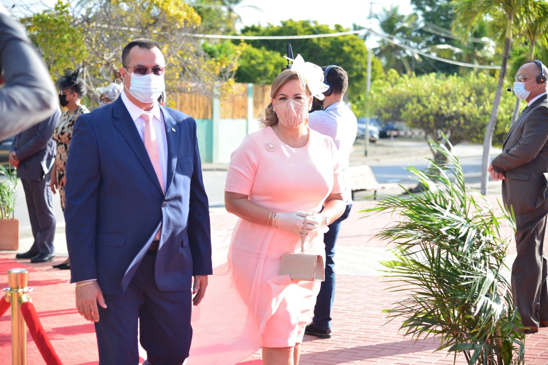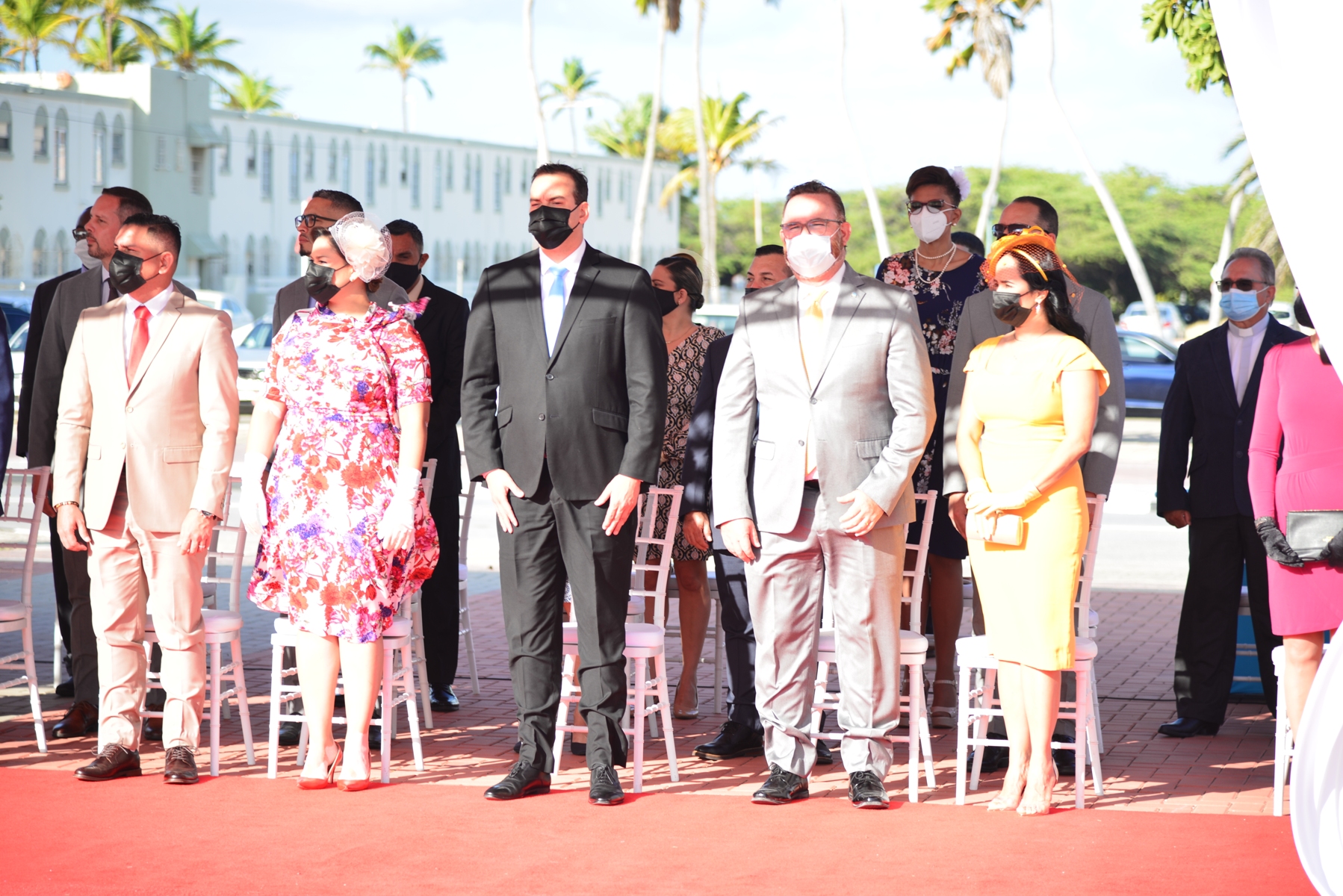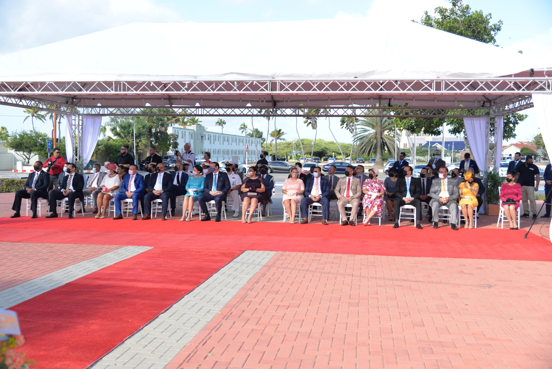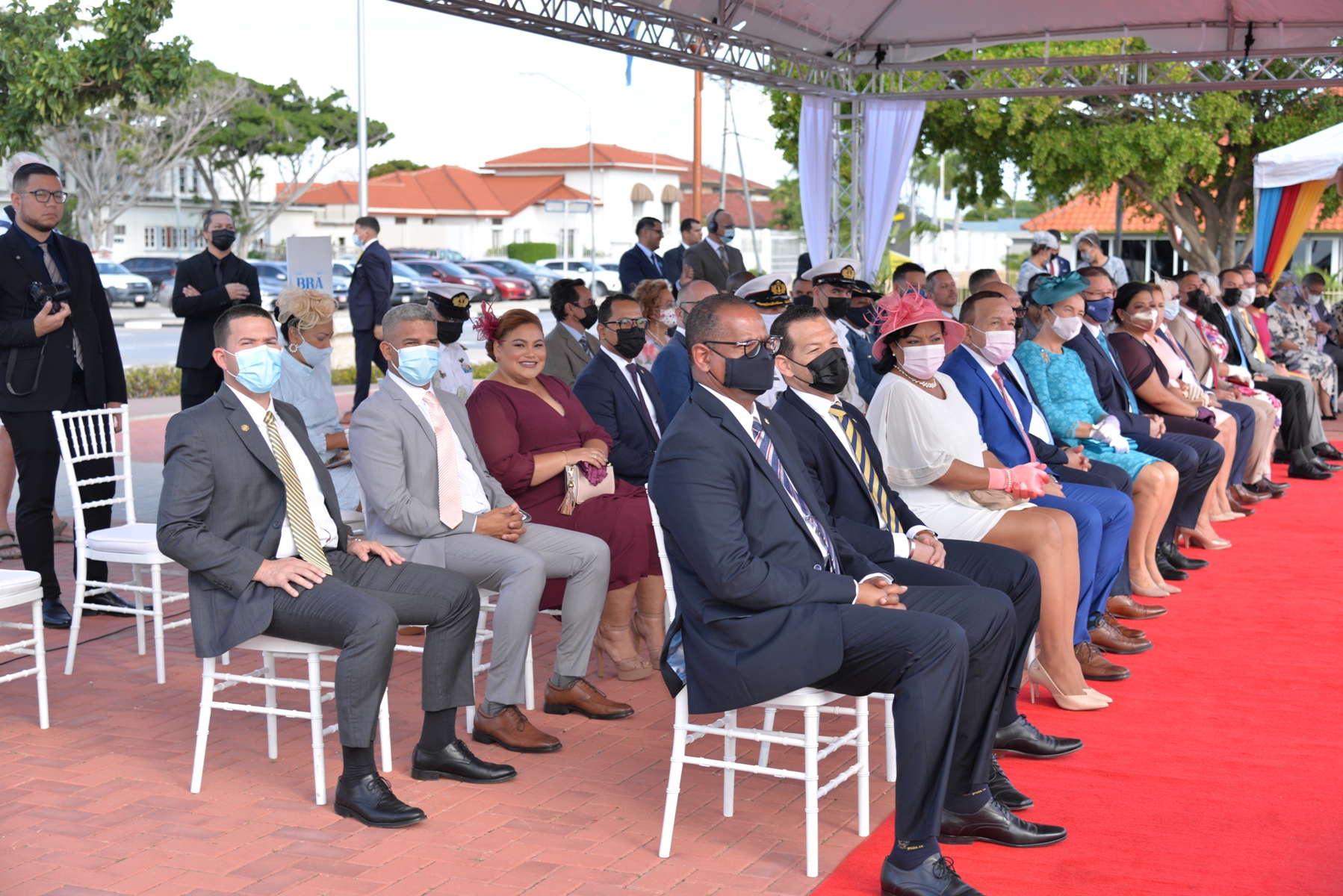 Despues di e yegada di Minister, Parlamentarionan, y otro funcionarionan di gobierno, a ricibi Gobernador Alfonso Boekhoudt y su distinguido Esposa, y e acto a cuminza cu entonacion di Himno Nacional Aruba Dushi Tera, interpreta pa e dos hobencitanan Angelina Leon y Lisienn Web, dirigi pa señor Danny Koolman.