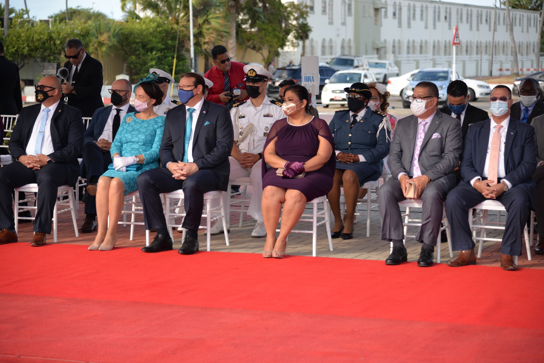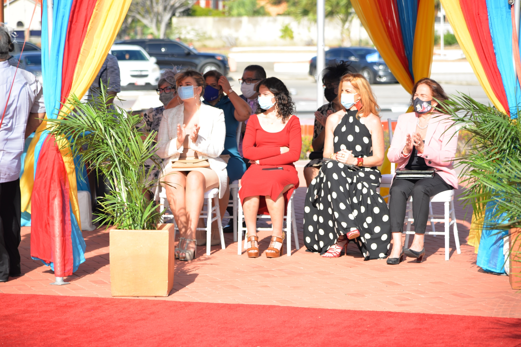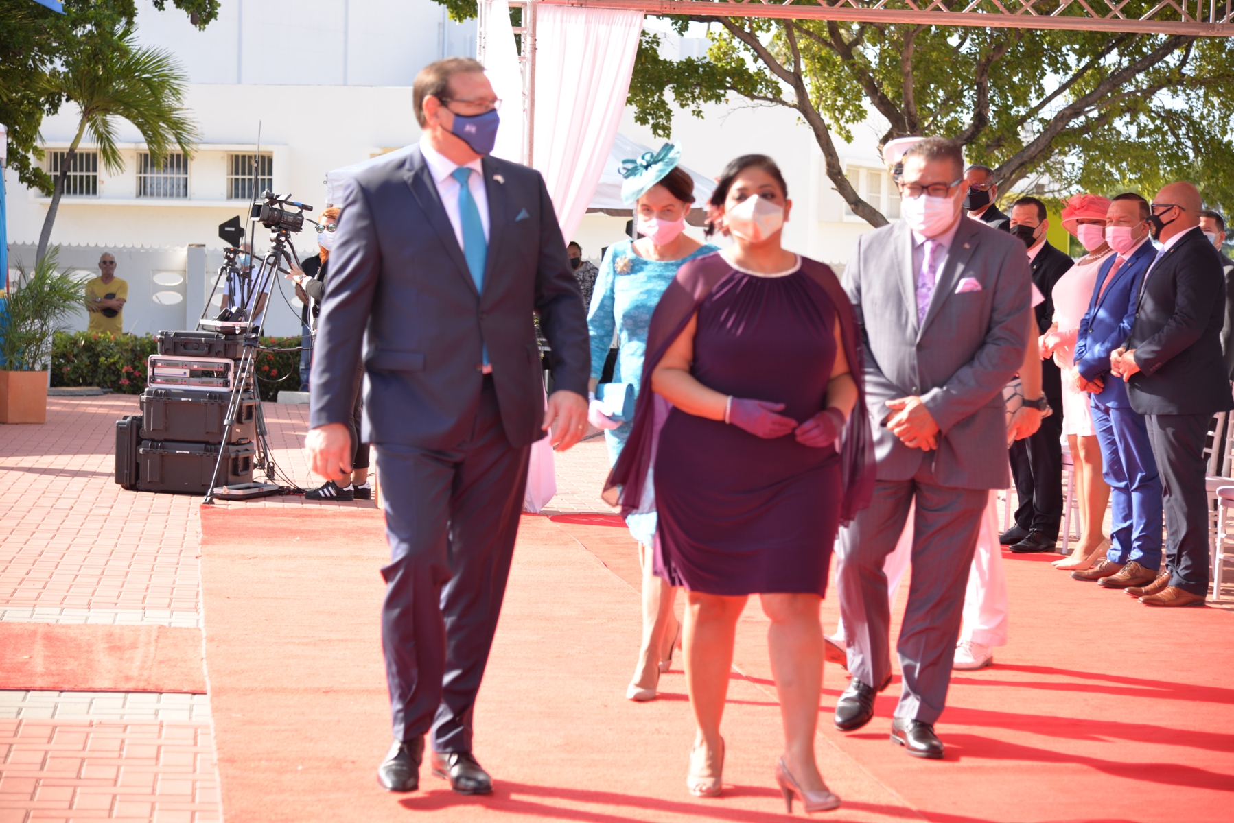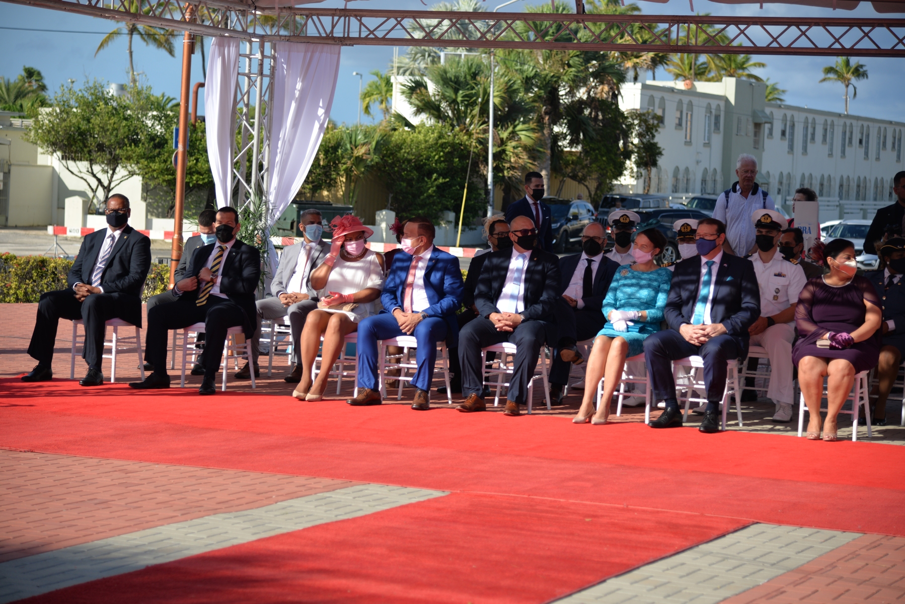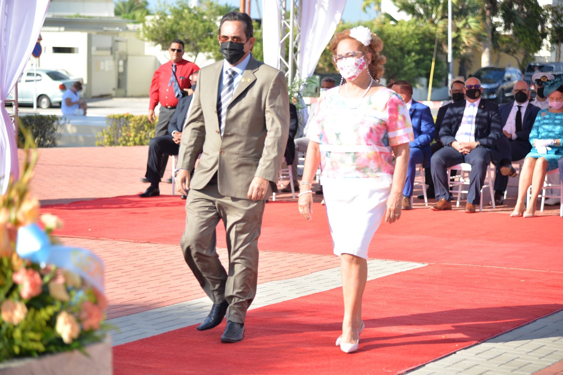 Despues di e yegada di Minister, Parlamentarionan, y otro funcionarionan di gobierno, a ricibi Gobernador Alfonso Boekhoudt y su distinguido Esposa, y e acto a cuminza cu entonacion di Himno Nacional Aruba Dushi Tera, interpreta pa e dos hobencitanan Angelina Leon y Lisienn Web, dirigi pa señor Danny Koolman.