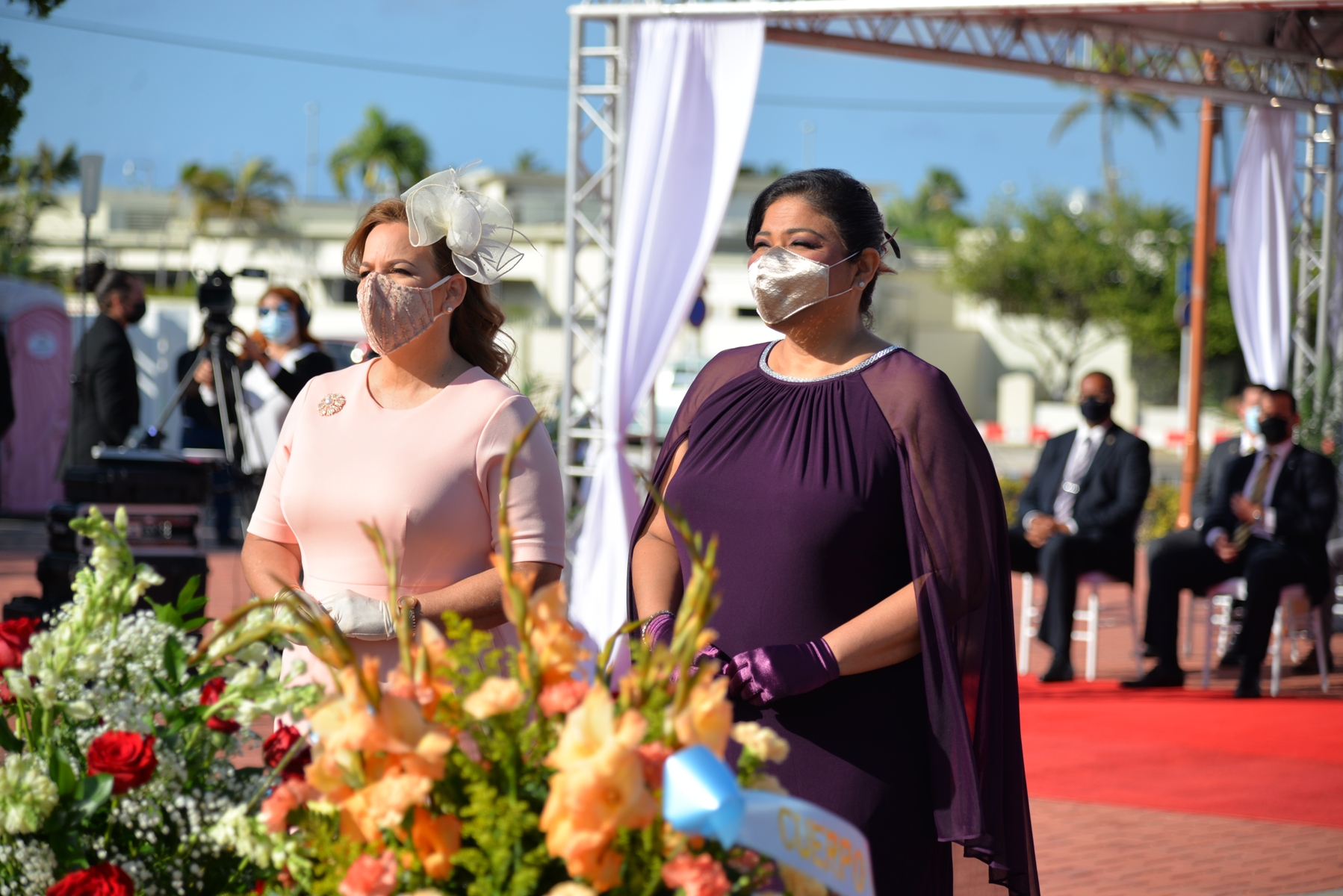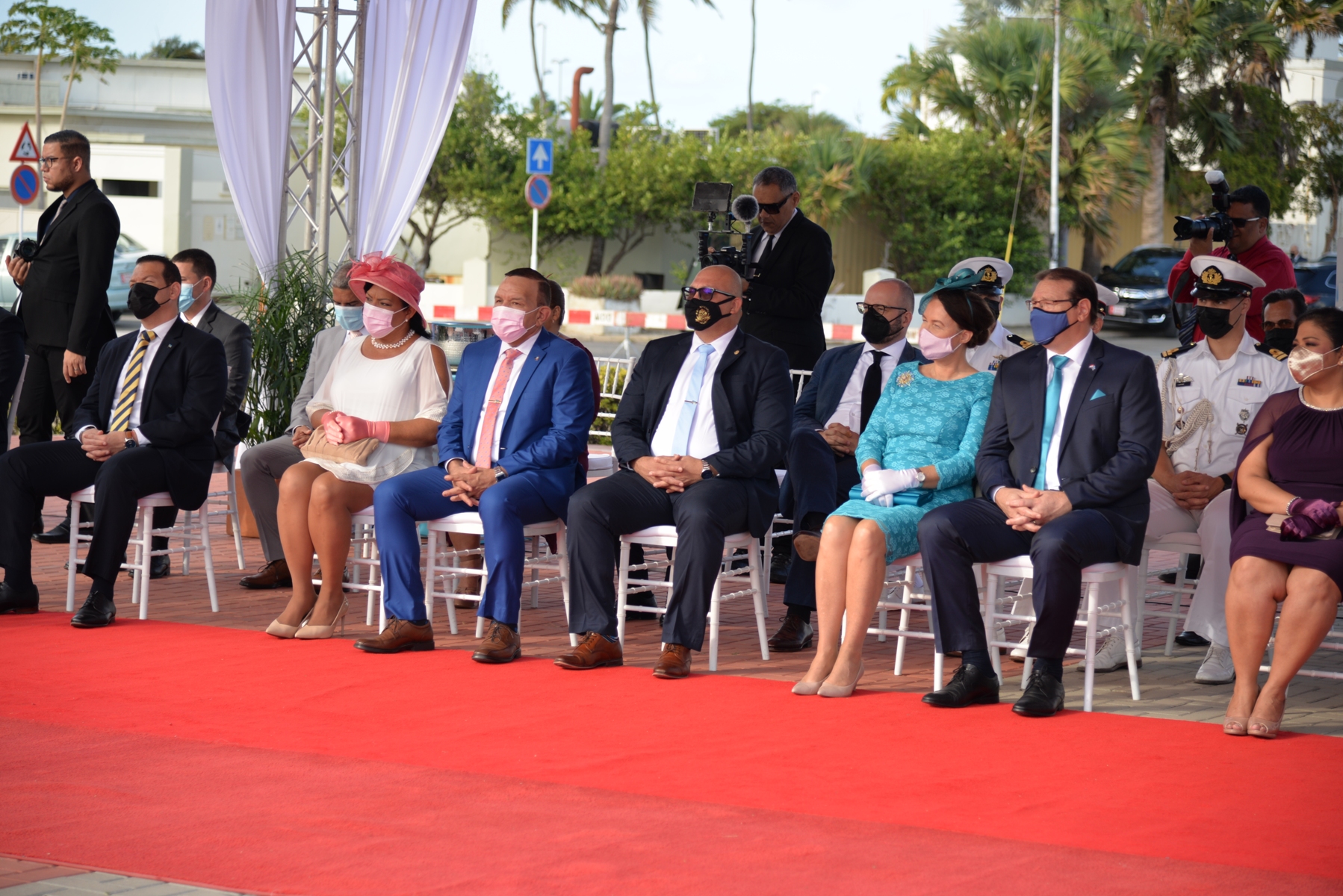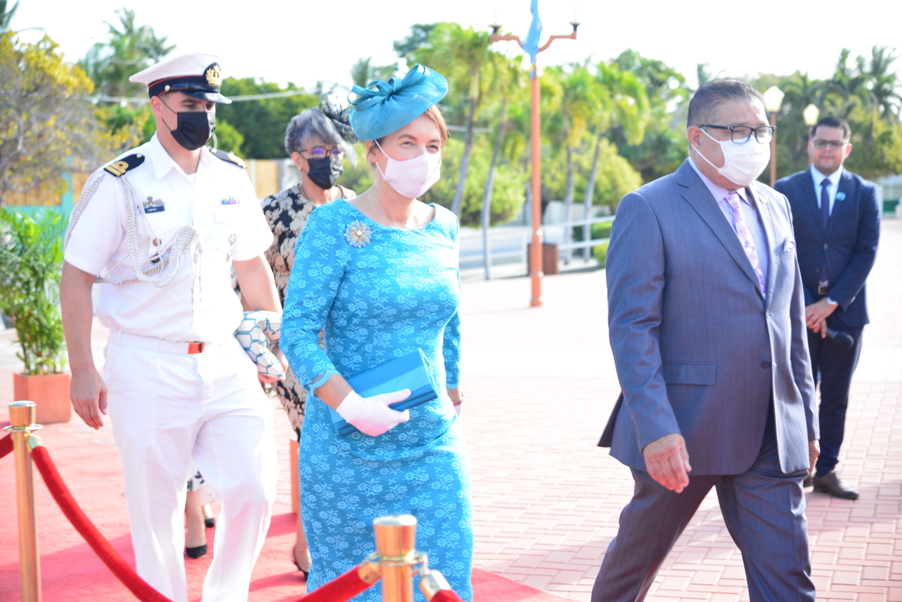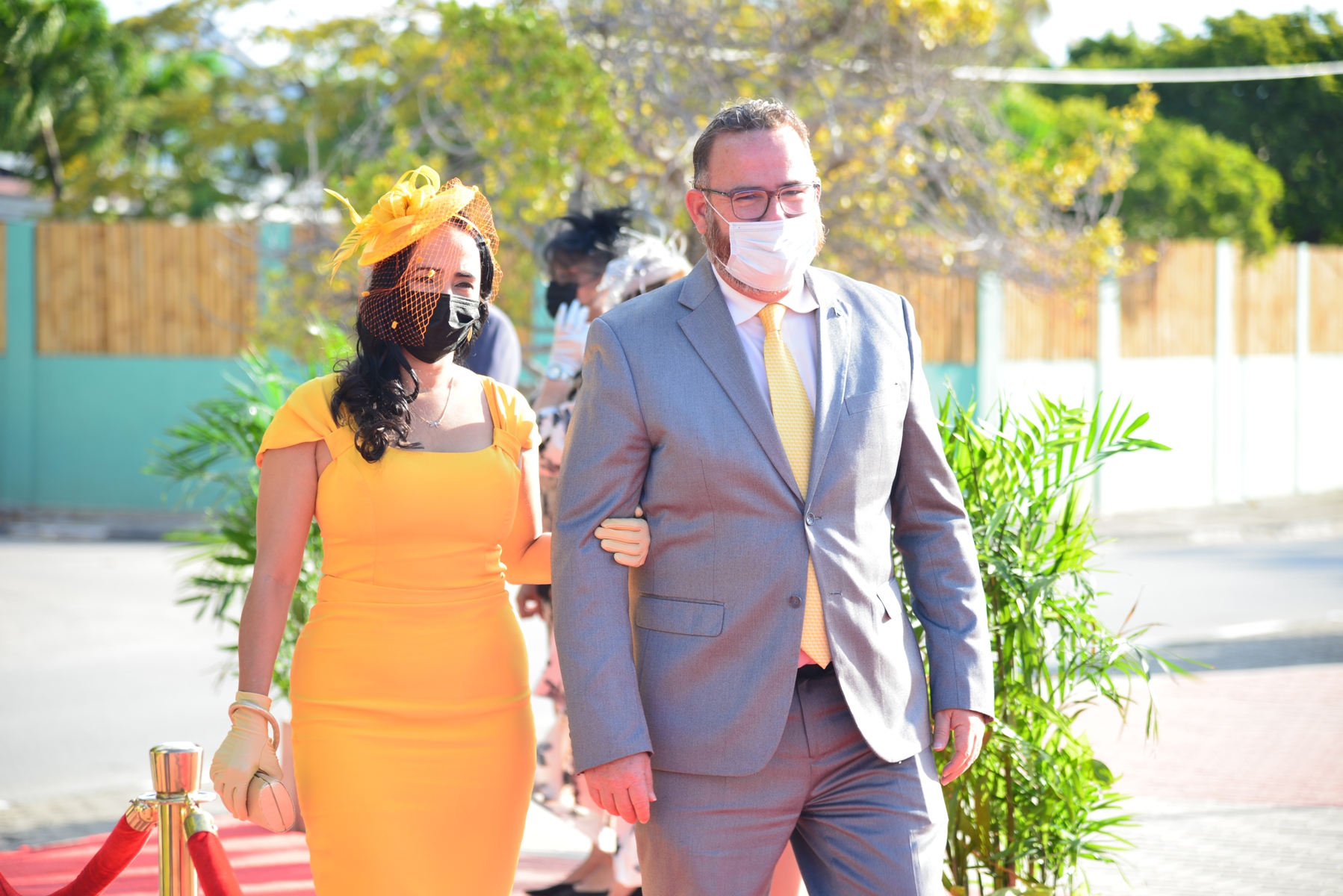 Despues di e yegada di Minister, Parlamentarionan, y otro funcionarionan di gobierno, a ricibi Gobernador Alfonso Boekhoudt y su distinguido Esposa, y e acto a cuminza cu entonacion di Himno Nacional Aruba Dushi Tera, interpreta pa e dos hobencitanan Angelina Leon y Lisienn Web, dirigi pa señor Danny Koolman.