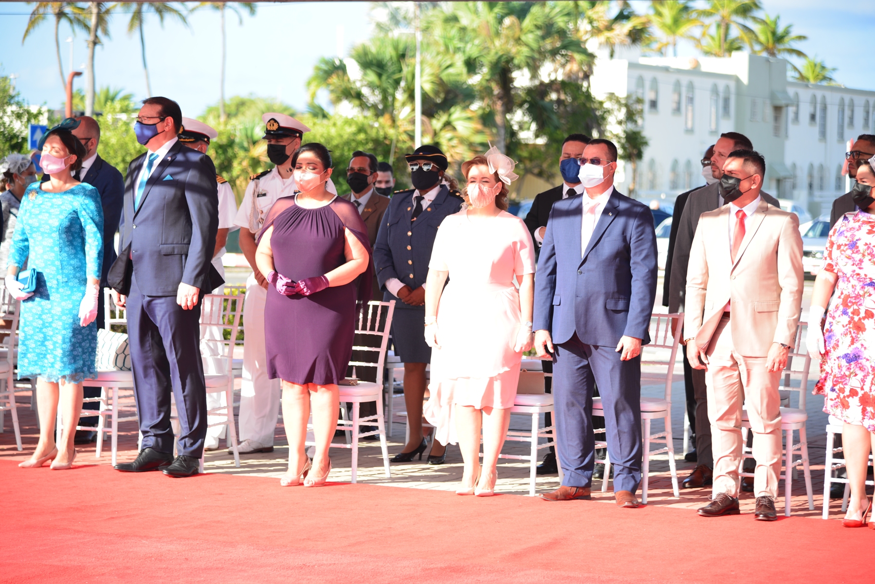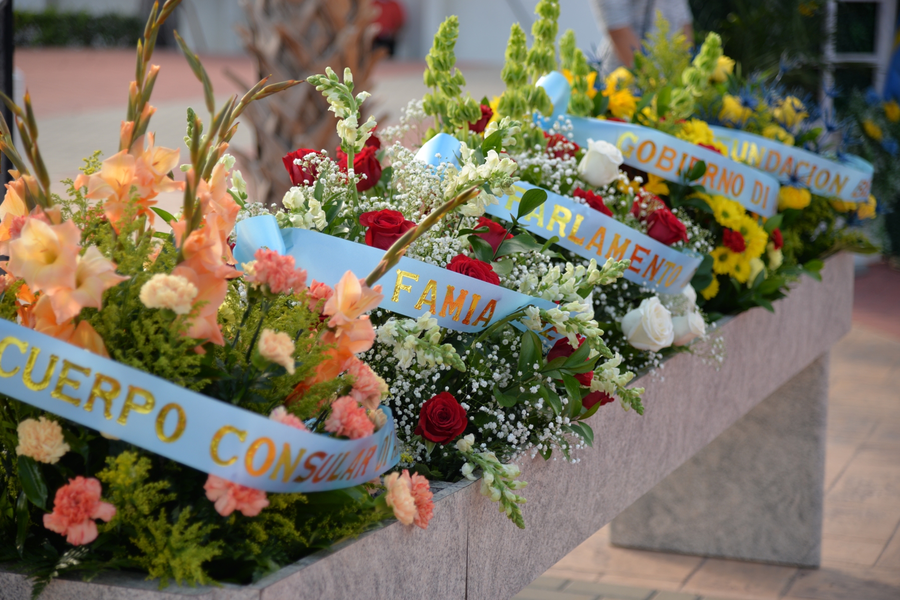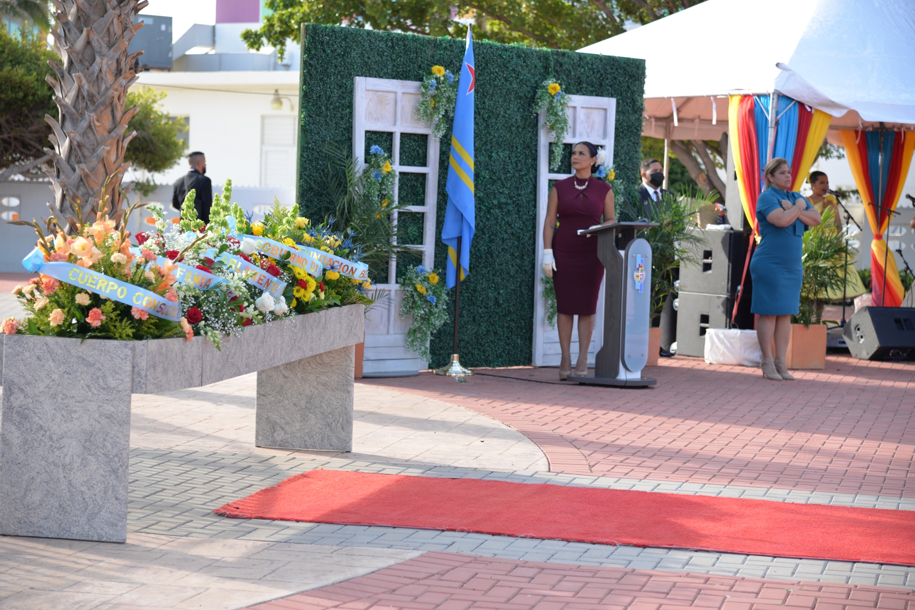 Despues Presidente di Parlamento mr.Edgard Vrolijk hunto cu Griffier mr. Herman Hek, a rindi tributo na Libertador dilanti su monumento, sigui den nomber di Gobierno, pa Minister Presidente mr. Evelyn Wever-Croes y Minister di Cultura mr. Xiomara Maduro, y den nomber di famia Croes a bay dilanti e dos muchanan muher, Franchesca Saladin y Tiara Croes. Finalmente, den nomber di Cuerpo Consular Arubiano, señor Carlos Augusto, y e Consul di Costa Rica Cecilia Arendsz Flores-Vries a rindi e homenahe. No tabata tin ofrenda floral.