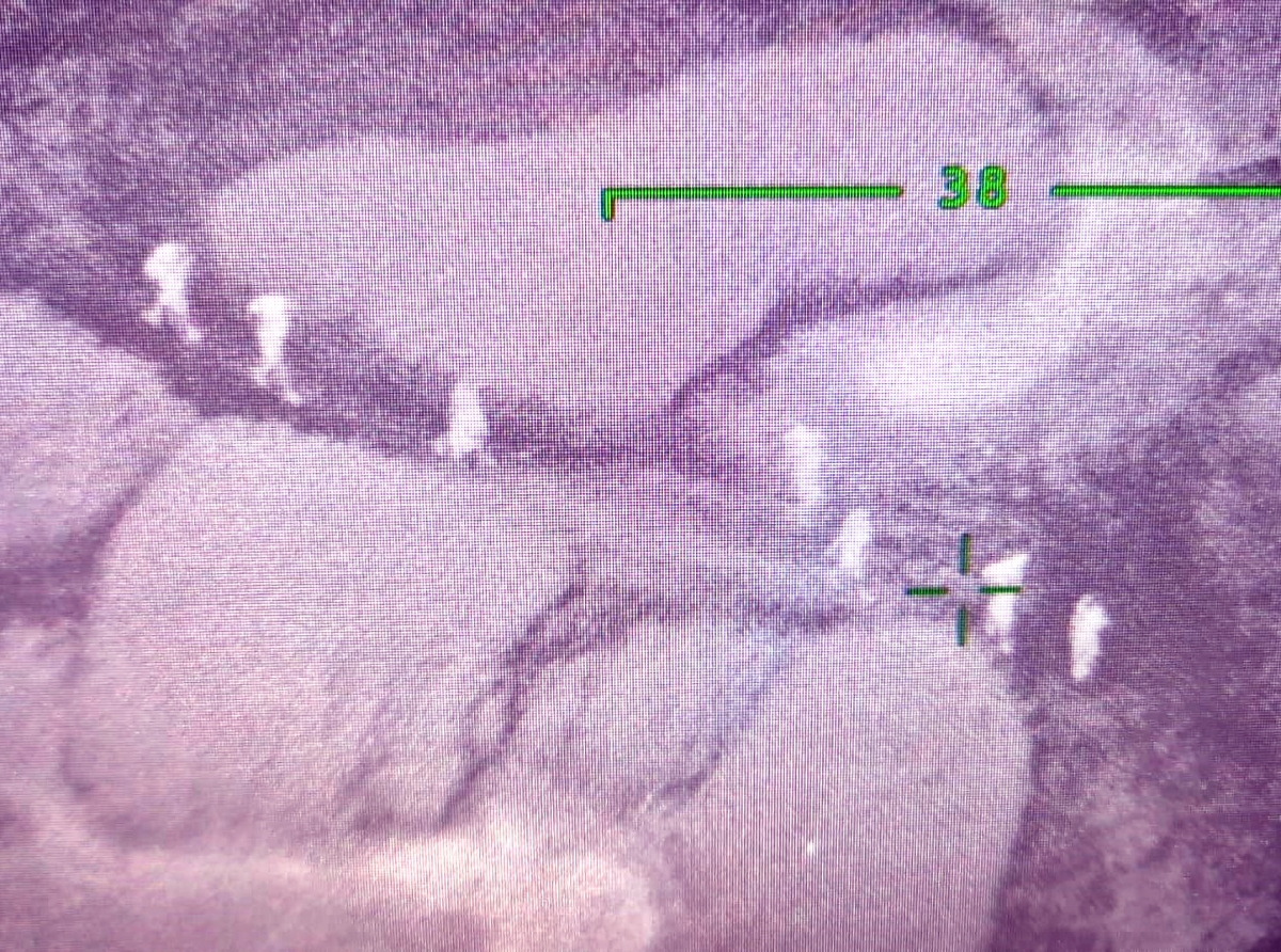 E anochi ey, radar a detecta un boto sospechoso bayendo direccion Zuid-Post di Aruba. E avion Dash-8 di Wardacosta a bula pazuid di Aruba, y for di distancia leu tabata siguiendo e boto aki, y vigila tur movimento di e boto y su tripulantenan ora cu nan a yega na tera. Nan tin camera abordo cu ta zoom-in di leu y cu Infrared. Riba e potret aki mes por mira imagen Infrared di e camera potente di e avion, ta captando momento cu esnan riba e boto ta yuda carga.