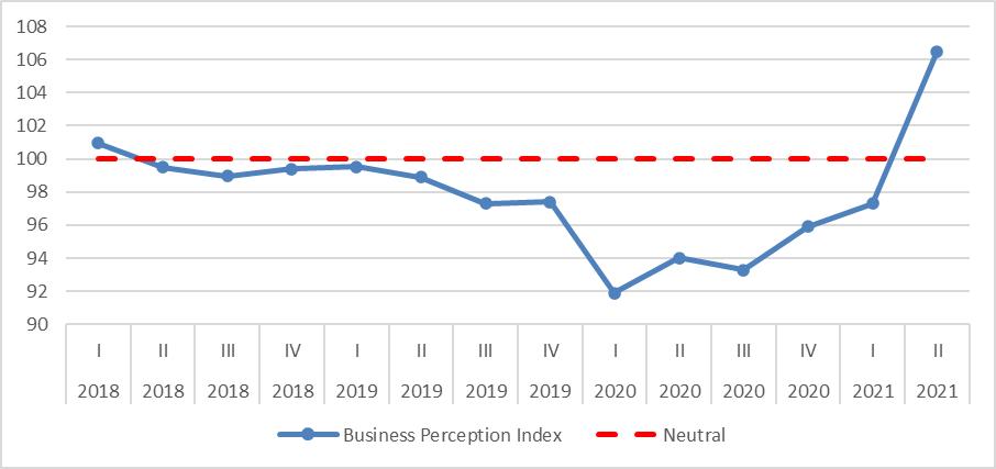 Durante e segundo trimester di 2021, e asina yama ‘Business Perception Index’, cu ta consisti di e indicenan di condicionnan economico actual y condicionnan economico a corto plaso, a nota un subida di 9,2 punto di indice te na 106,5 riba 100 desde e promer trimestre di 2018, cual ta refleha un mehoracion den confiansa di negoshinan (Grafiek 1). Esaki ta debi na un mehoracion den e percepcion di negoshinan pa cu tanto condicionnan economico actual y a corto plaso.