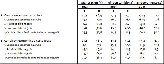 E indice di condicionnan economico actual a expande cu 11,7 punto di indice te na 105,4 compara cu 93,7 den e di promer trimester di 2021. Tambe, e indice di condicionnan economico a corto plaso a registra un crecemento di 5,0 punto di indice, esta for di 102,7 den e di promer trimester di 2021 te na 107,7 den e di segundo trimester di 2021 (Tabel 1).