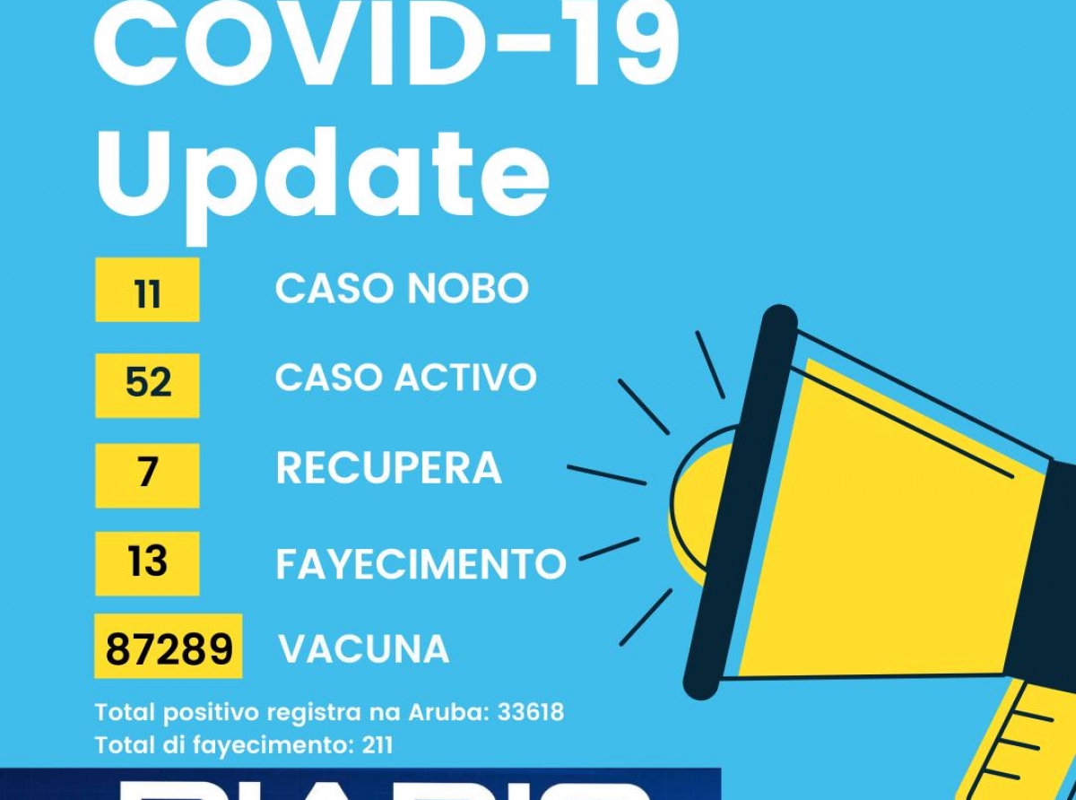 ORANJESTAD (AAN): Siman a habri cu 7 persona recupera y un total di 11 caso nobo di COVID-19 cu a keda registra di cual 2 ta no-residente. E cifranan aki ta representa un 'Positivity rate' bou di e residentenan di 39% y e cantidad di casonan activo di COVID-19 ta 52.
