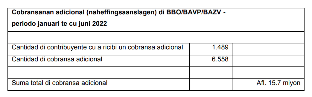 Segun e cifranan, e empresanan cu a entrega nan declaracion di loonbelasting y BBO/BAVP/BAZV di e periodo januari te cu juni di aña 2022, no a paga e suma di impuesto cu ta coresponde cu nan propio declaracion y/of no a paga na tempo.