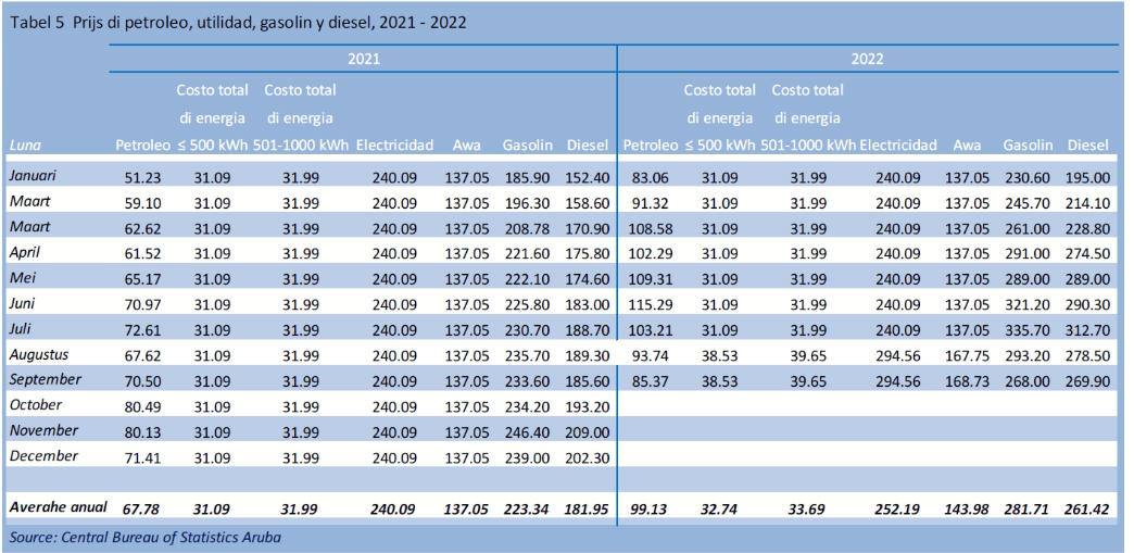 ORANJESTAD (AAN): Segun informe di luna di September 2022 di Central Bureau di Estadistica, prijs di utilidad (electricidad y awa), gasolin y diesel