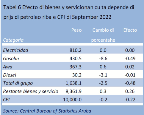 Na September 2022, utilidad, gasolin y diesel como grupo, tawata tin un caida di prijs di 2.5% compara cu Augustus 2022 y hunto tawata tin un influencia di -0.48 ppt riba e CPI, mientras cu e restante 404 bienes y servicio hunto, a conoce