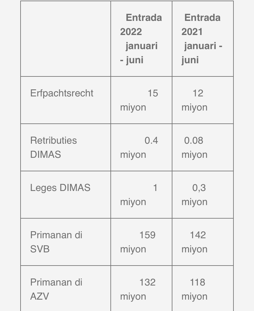 Den e prome mita di aña (januari te cu juni) 2022, Departamento di Impuesto a registra un total di 469 miyon florin na entrada di toeristenheffing, primanan di AOV/AWW y AZV, erfpachtscanon y entrada pa gasto di permiso di DIMAS, cualnan ta destina pa instancianan manera ATA, TPEF, SVB, AZV, DIP y DIMAS. Den e mesun periodo na aña 2021, e entrada a suma 378 miyon. Pues un aumento significativo di 24%.