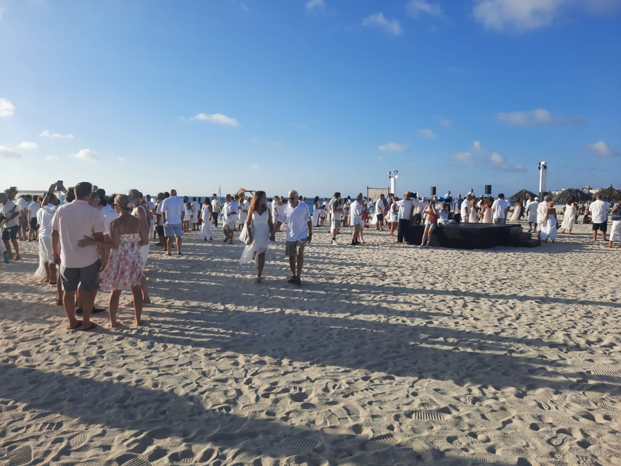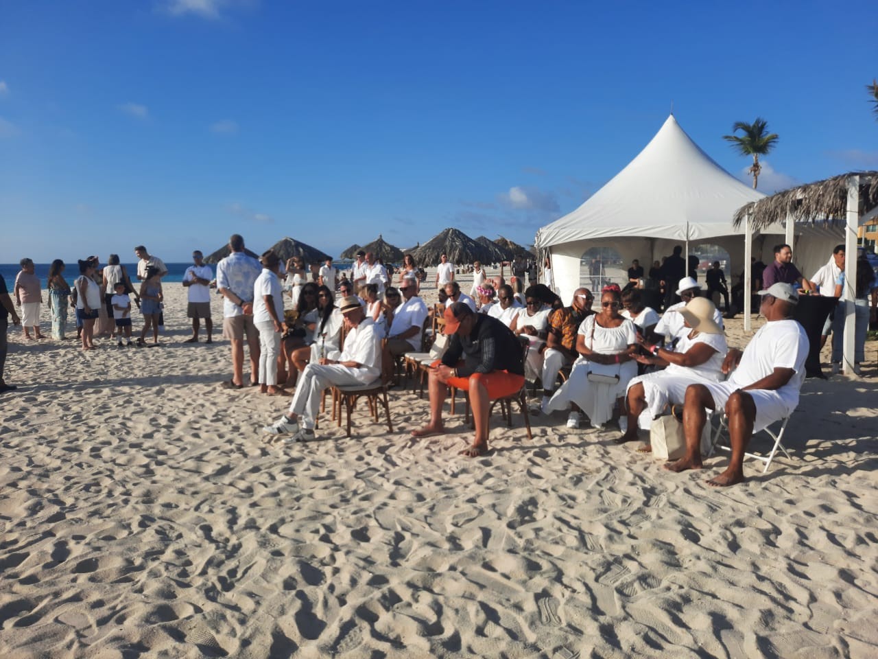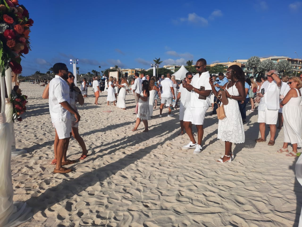 Hopi pareha bisti na blanco a yega Eagle Beach pa disfruta di e tremendo ceremonia aki na Aruba den ambiente di steel pan. Por conta cu parehanan cu ta casa algun aña y otronan cu hopi aña casa, incluyendo parehanan cu mas di 50 aña casa.