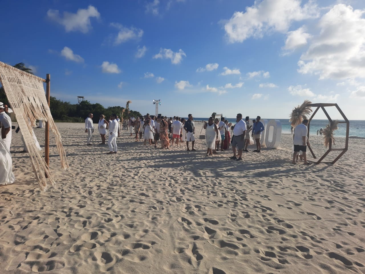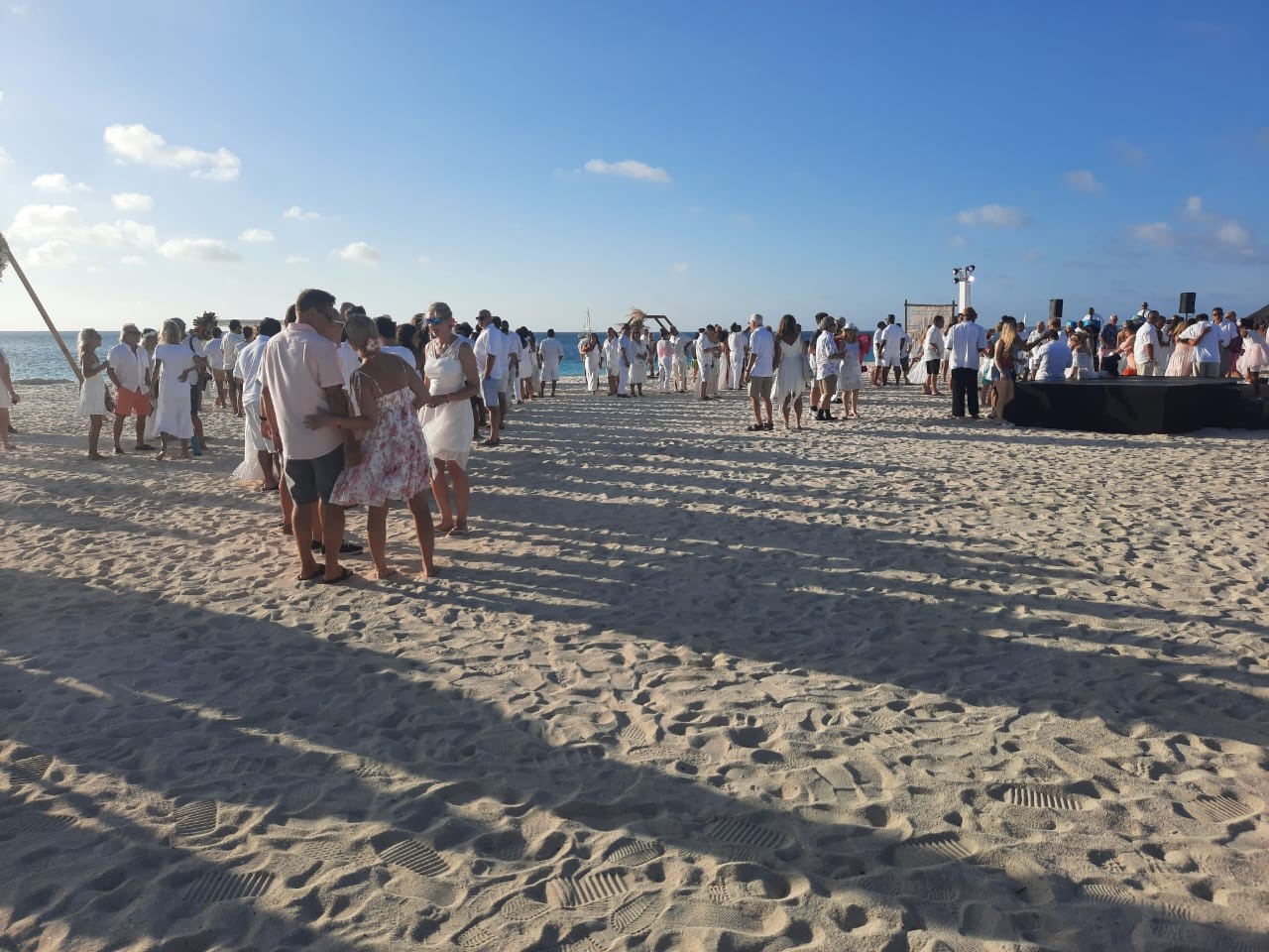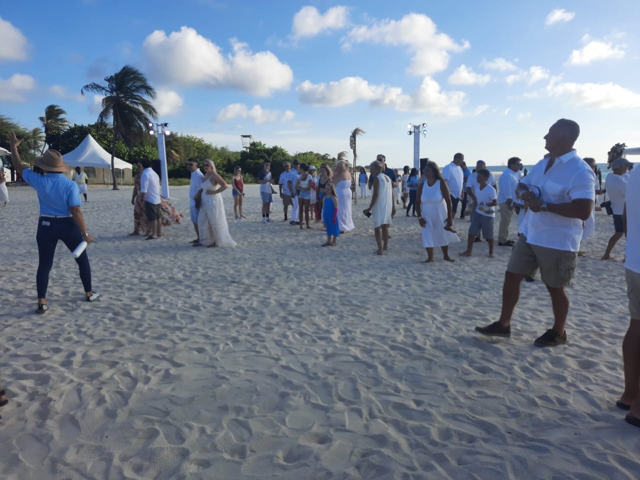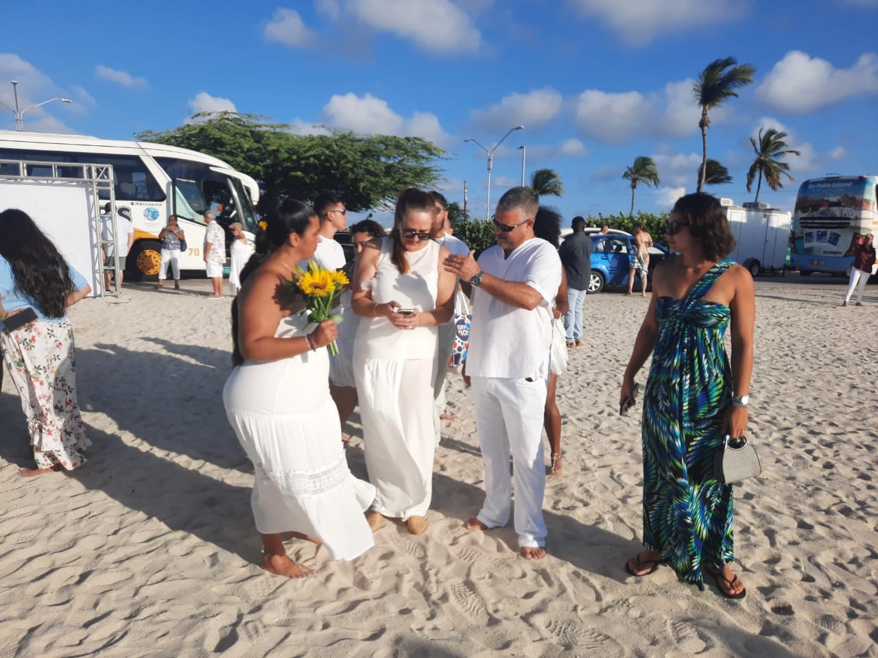 Hopi pareha bisti na blanco a yega Eagle Beach pa disfruta di e tremendo ceremonia aki na Aruba den ambiente di steel pan. Por conta cu parehanan cu ta casa algun aña y otronan cu hopi aña casa, incluyendo parehanan cu mas di 50 aña casa.