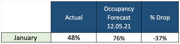Ocupacion: E grado di ocupacion tabata 48%; cual ta un recuperacion di solamente 55% compara cu Januari 2019. Anteriormente a proyecta ocupacion di 76% pa Januari 2022, pero e ultimo ola di COVID a causa hopi cancelacion y a perde 37% di reservacion.
