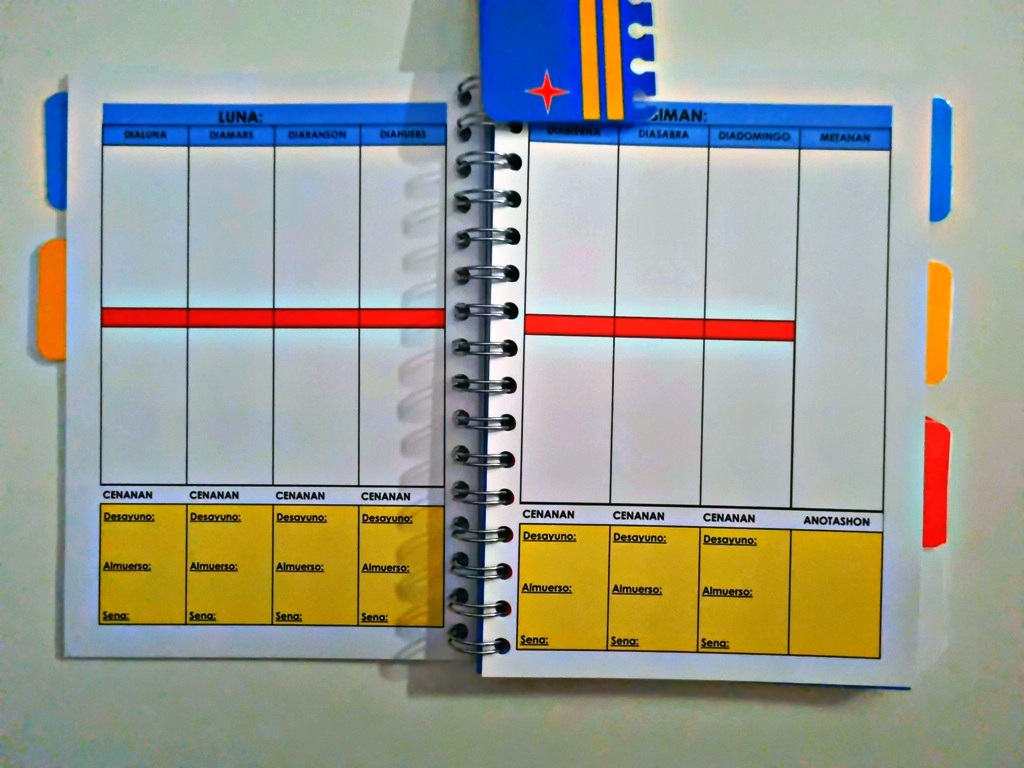 E ta yudabo pasobra e ta un planner pa 12 luna. Bo mes por dicidi cu cua luna bo ta cuminsa. Cada luna tin un resumen di luna, un diferente lay-out, un tracker di presupuesto y tracker di luna. Tambe cada luna ta bin cu un combinacion di: menu di siman, tracker di costumber, metanan di siman, lista di tarea, top prioridadnan, anotashonnan y lista di compra. Tambe cu un bookmark di Aruba, 8 sticker di Aruba y sticker di e lunanan. Asina cada persona por personalisa e planner segun su gusto.