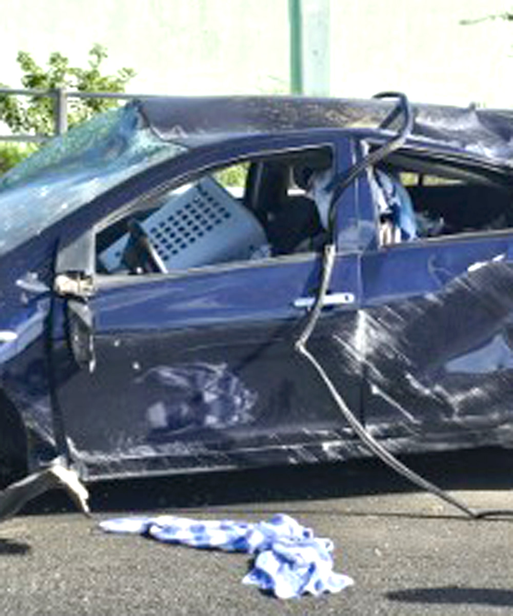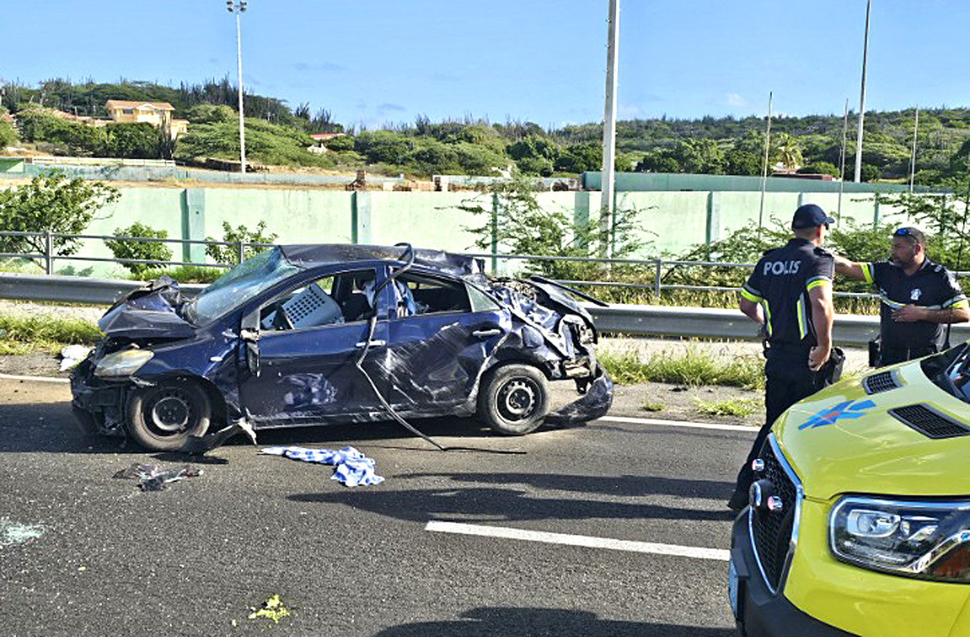 Ambulance a core sali tambe pa e lugar. Na como 125 meter pabao di Young Fellow Bar & Restaurant, patruya a bin haya un auto sedan Toyota Yaris color blauw scur cu number A-69472. E auto tabata tur kibra rond, pero riba su cuatro wielnan. Testigonan a splica cu e auto a perde control y bolter violentamente diferente biaha y a cay bek riba su cuatro wielnan.