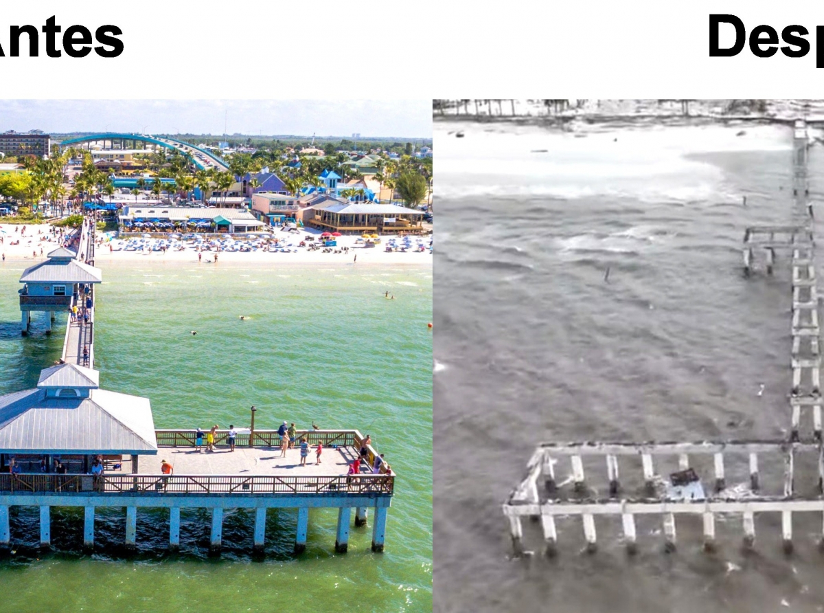 Loke ta mas impresionante ta e destruccion cometi riba Fort Myers Beach Pear. Full e edificio, y infrastructura traha riba e Pier aki a desaparece den apenas par di ora. Djis e palonan cu ta sali for di lama a keda ainda.