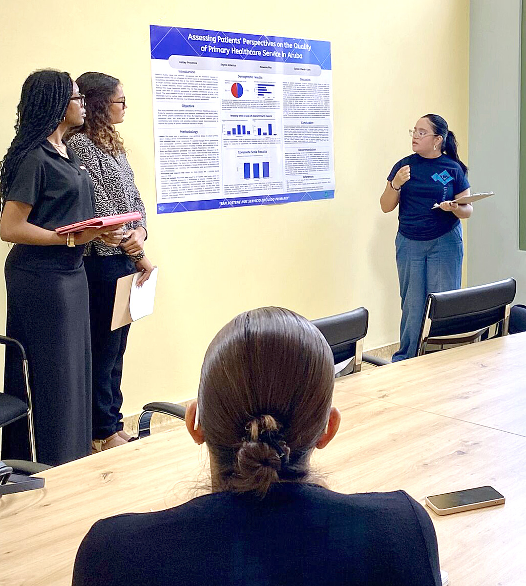 Ademas di esey, nan tabata presente durante e presentacion final di e research poster. E profesionalnan di IVA ta gradici e studiantenan pa nan dedicacion y profesionalismo durante henter e trayecto, y tambe ta gradici Universidad di Aruba pa promove colaboracion importante entre practica y academia.