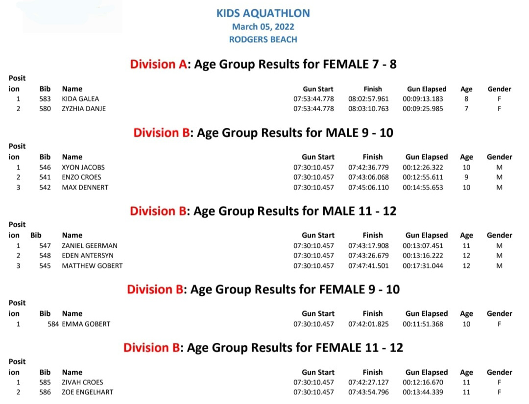 ORANJESTAD (AAN)- Diasabra mainta a tuma lugar na Rodgers Beach e campeonato di Kids Aquathlon.