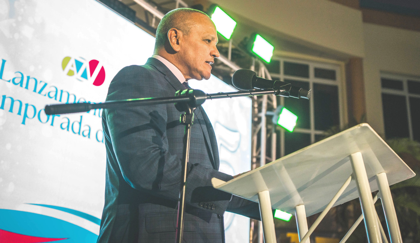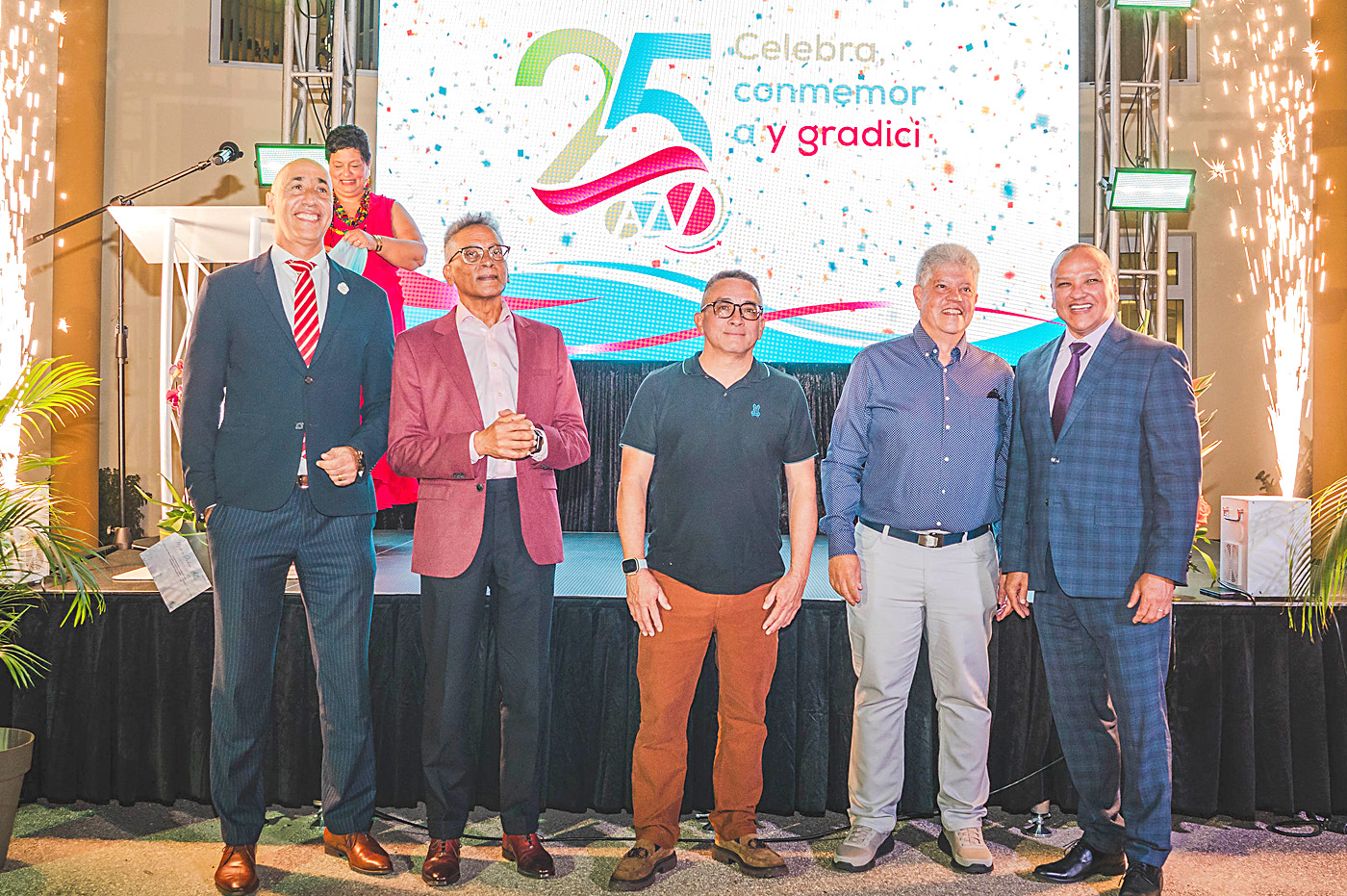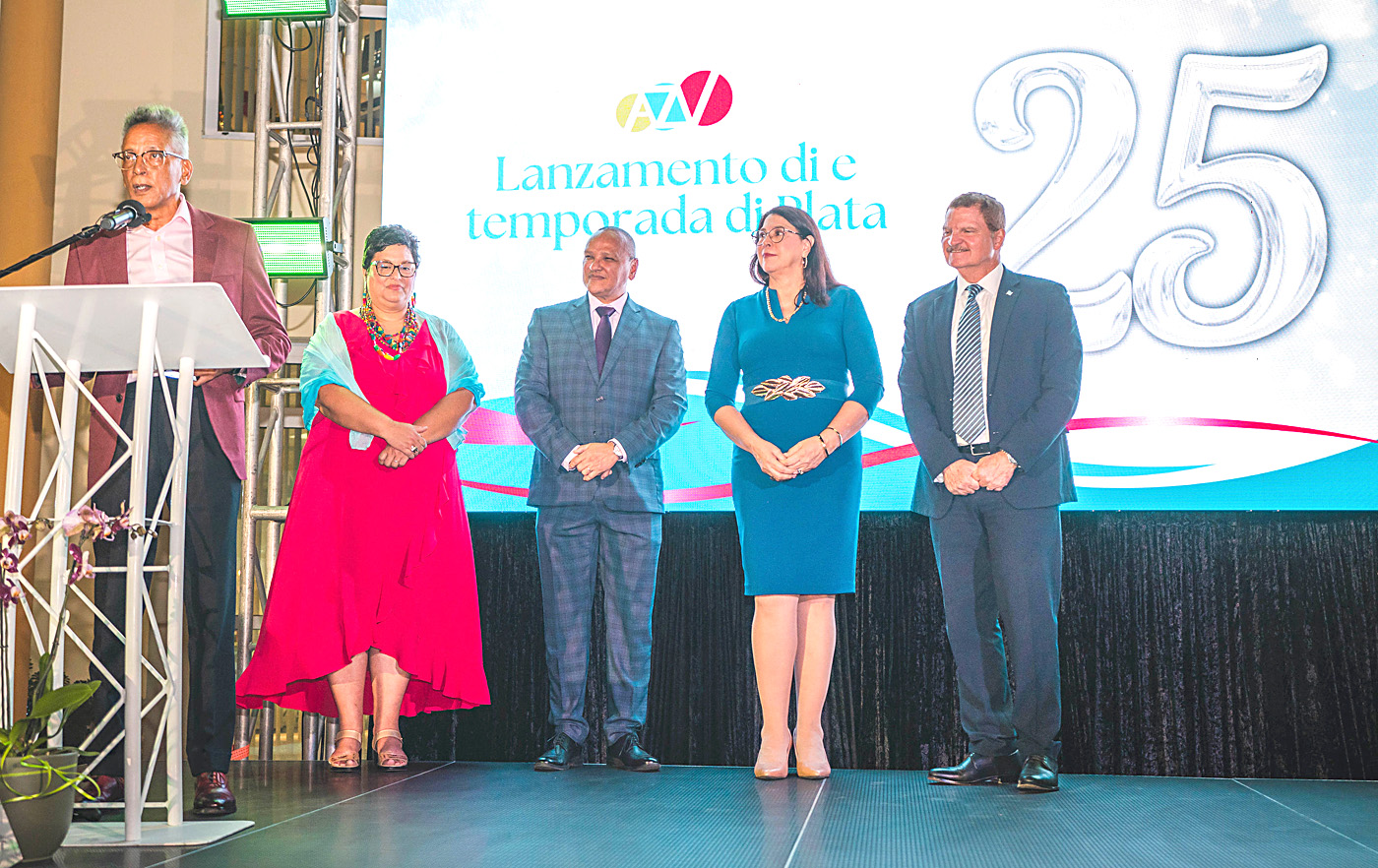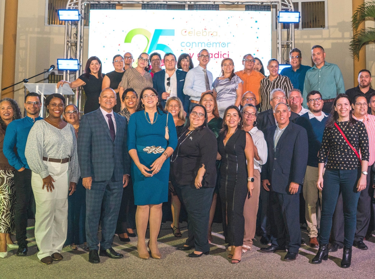ORANJESTAD (AAN): Diahuebs anochi, meymey di invitadonan y partnernan di sector di cuido di Aruba, di Colombia y e famia di Organo Ehecutivo AZV (OE AZV), Prome Minister Mike Eman, Minister Mervin Wyatt-Ras y director di OE AZV a desvela e logo cu durante 2026, OE AZV lo uza relaciona cu 25 aña di existencia di nos seguro AZV.