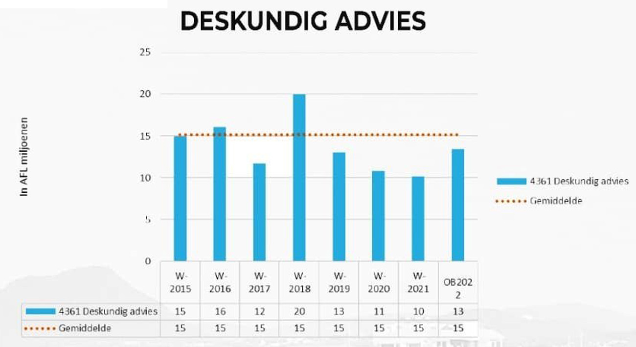 Pa aña un promedio di 15 miyon florin ta bay na gasto di experto. Di e suma aki un 64%, esta 9 miyon florin, ta bay normalmente pa paga pa e proyectonan di IT na DIMP y pa conseho huridico. Sinembargo den aña 2016 y 2018 por mira cu tin un subida di gasto y e analisis ta mustra cu e subida ta debi na e proyecto di automatisacion DIMPLE na DIMP na aña 2016 y gastonan di abogado pa e caso di garantia na Eagle Beach Hotel NV cu a wordo declara failliet na aña 1993 y cu abogado mester a caba di atende cu e caso aki na aña 2018. Despues por mira cu den aña 2019 pa 2021 e gastonan di experto ta bolbe baha y ta keda bou di e promedio.