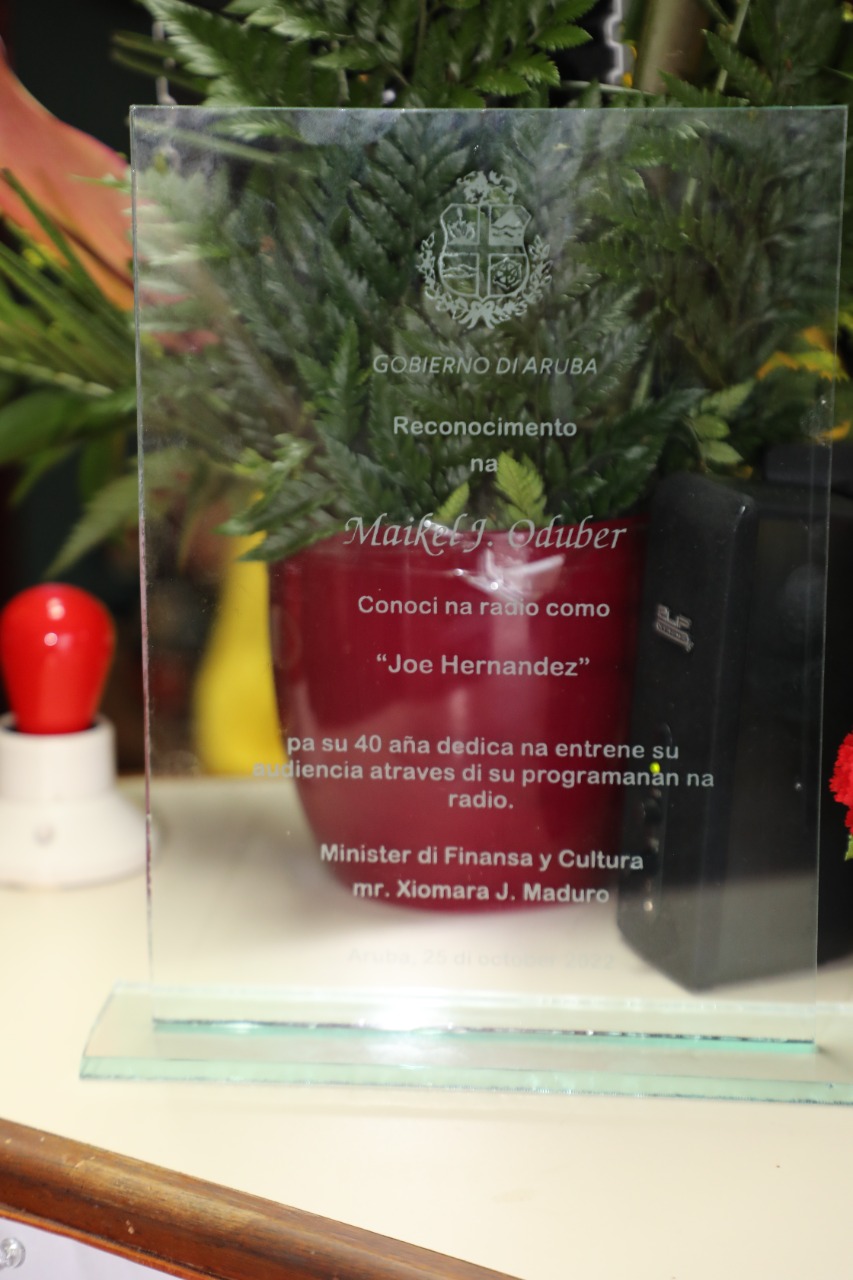 Joe a cumpli su 40 aniversario den radio difusion. Su exito ta su oyentenan na prome lugar, su consistencia, su voz agradabel, su amor pa radio, su dedicacion y pasion pa su programanan tur dia. Minister di Cultura un bes mas ta gradici Sr. Joe Hernandez” pa 40 aña di dedicacion na entrene su audiencia atraves di su programanan na radio.