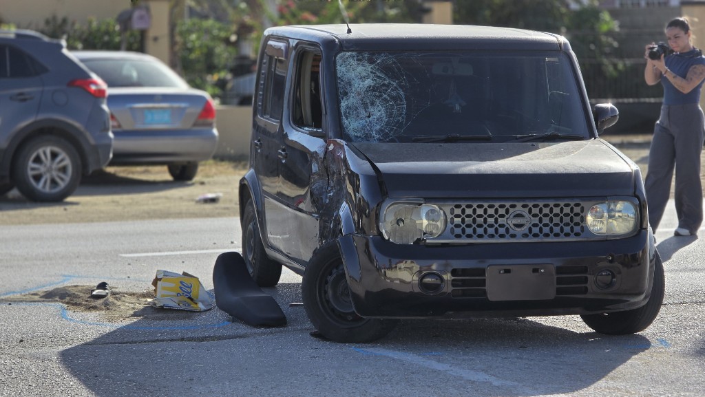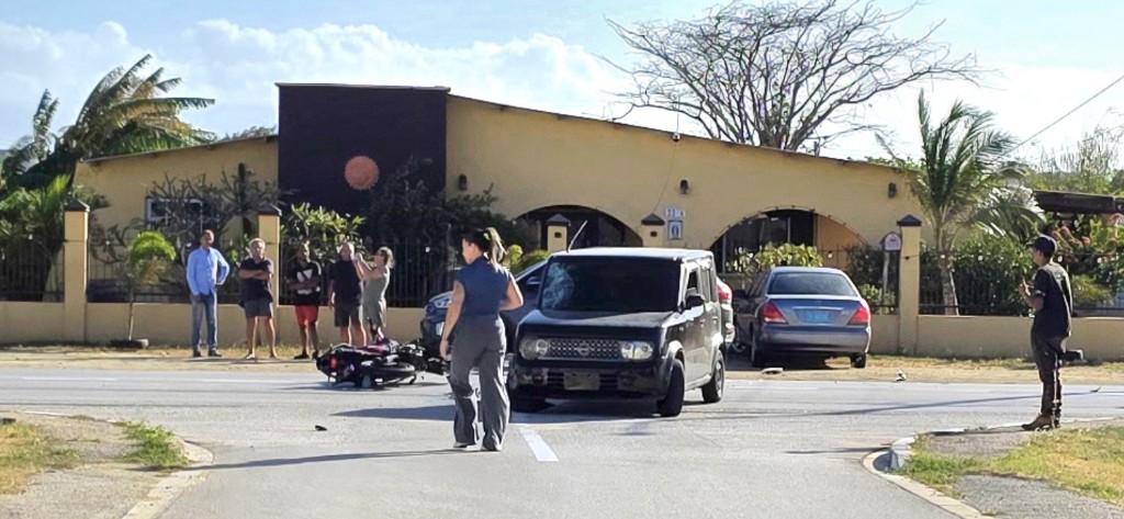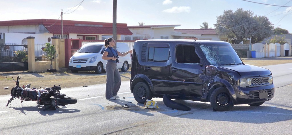 Banda di e auto a haya un motociclista hoben seriamente herida cu golpinan fuerte na cara kende tabata sangra hopi. E motociclista tabata tin su helm bisti y e impacto a resulta den e area ey sin proteccion.