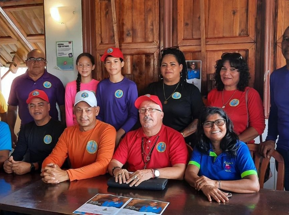 Ras ta gradici e team grandi cu e tin su tras y e boluntarionan. Henter e team aki lo bay sostene ora cu e baha y drenta den e Mina di Fosfaat.