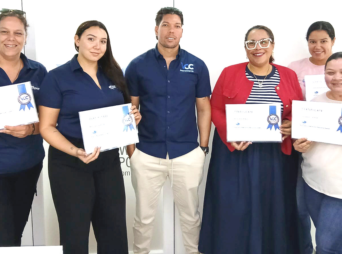 Na final nan a ricibi certificado di e curso exitoso aki. Pa e compania Aruba Wine & Dine a otorga certificado na Ellen Scholl y Darenska Mathilda. Pa Duty Free Aruba a otorga certificado na Arriana Lo-A-Njoe y Shermaine Ridderstap. Pa Do-it-Center Aruba a otorga na Charlayne Loefstok. Aki por mira nan feliz hunto cu nan instructor.