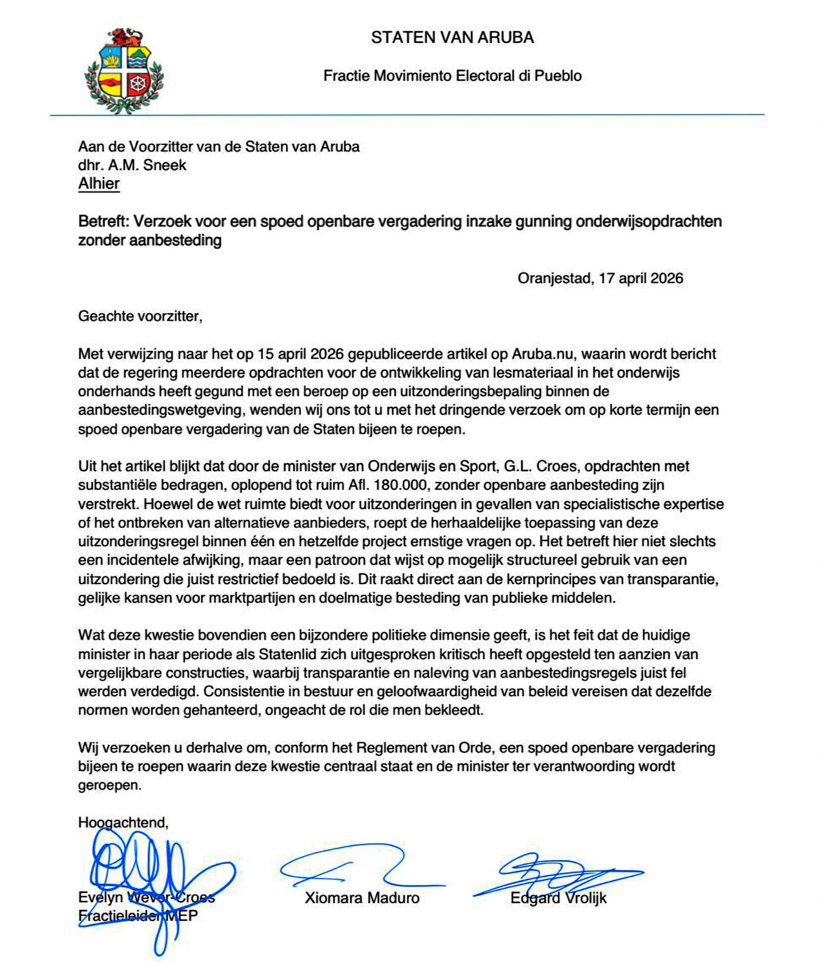 ORANJESTAD (AAN): Fraccion di MEP a haci un peticion pa yama un reunion publico urgente di Parlamento pa discuti e decisionnan recien di e Ministerio di Enseñansa y Deporte, baou di Minister di Gerlien Croes, pa otorga varios proyecto pa desaroya material di enseñansa sin proceso di destaho publico.