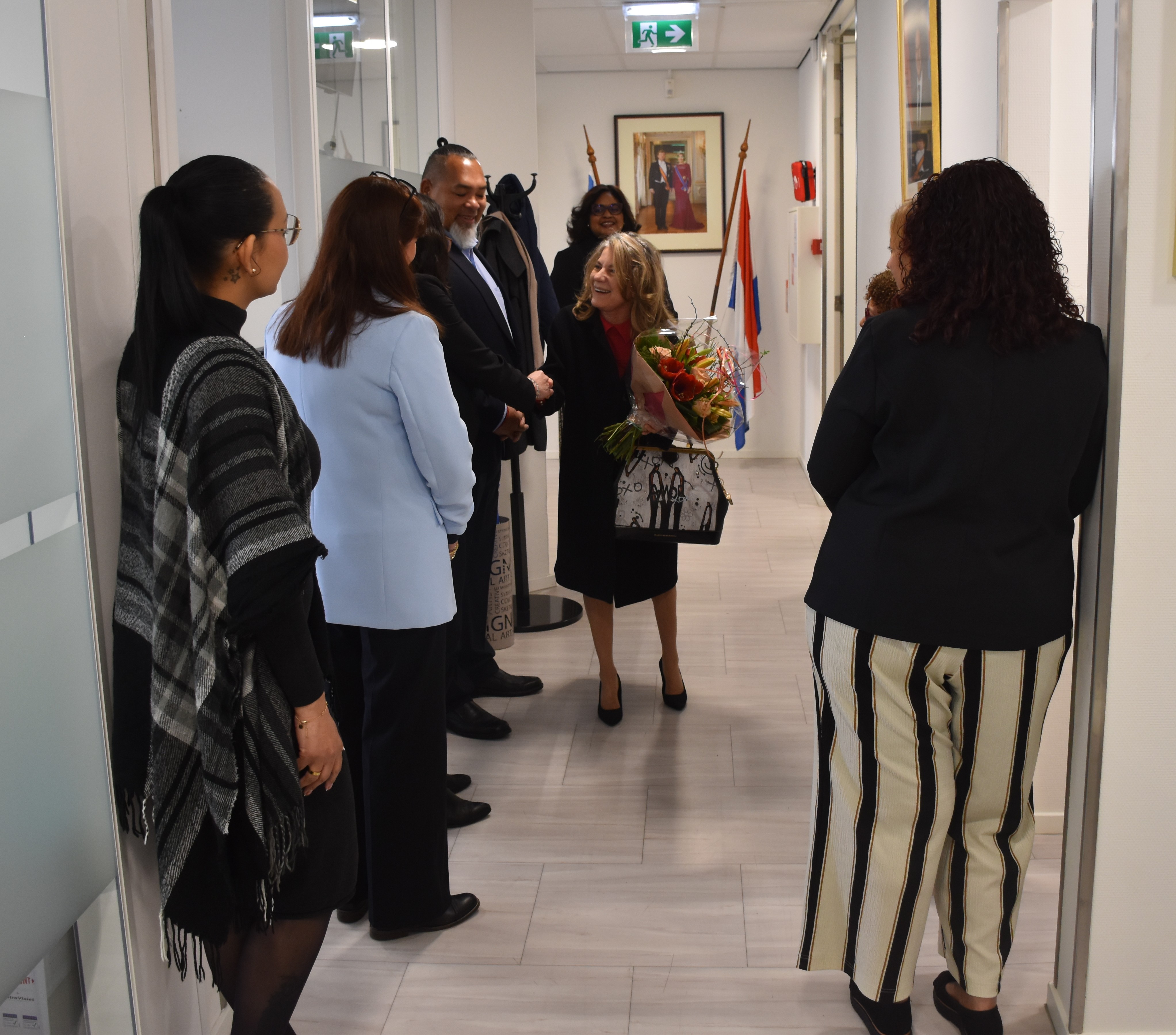 e mesun Diabierna riba su prome dia di trabao el a keda ricibi pa e personal di Kabinet di Aruba na entrada di e oficina. Hefe di e departamento huridico di Kabinet di Aruba mr. Shandra John a haci entrega den nomber di e personal un bouquet di flor na minister Schwengle. Despues e mandatario a cera conoci cu e resto di e personal.