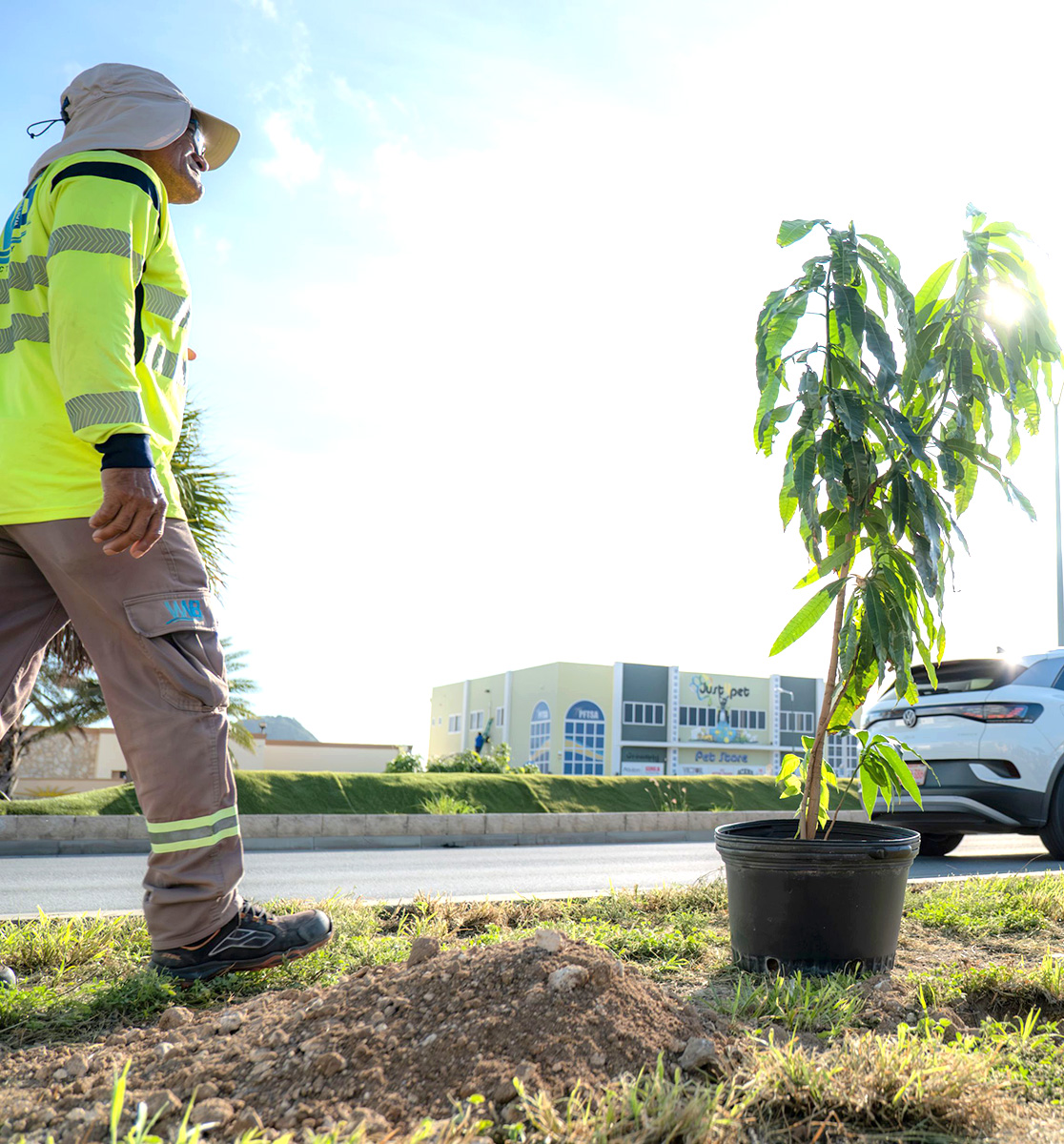 Watty Vos Boulevard (WVB) a prepara e tereno, coba buraconan, y pone gordura disponibel; tambe lo keda responsabel pa mantene y muha tur e plantacion nobo.