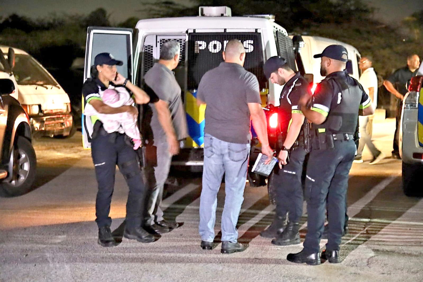 Un di esnan deteni ta un muher kende tin un baby di algun luna. Un agente policial femenino a tuma e baby over, mientras cu e muher a wordo aresta, pa asina e wordo transporta pa Warda di Polis unda e lo wordo interoga.