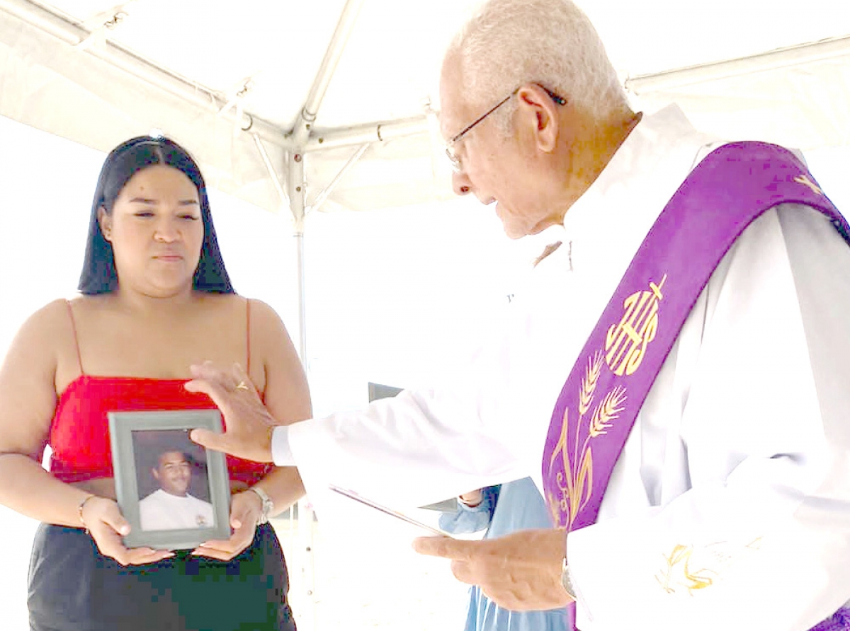 pa asina Pastoor a presenta y duna un respons, cu a sigui cu bendicion di e potretnan di nan ser keri, y tambe benta un krans den lama.