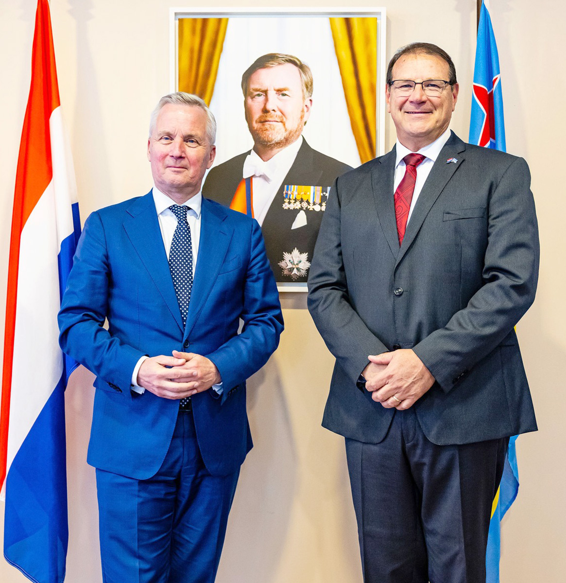 Sr. Van den Burg a wordo acompaña durante e bishita aki pa Sra. Barbera Wolfensberger, Director-General di Relacionnan di Reino, Sr. Gerbert Kunst, Representante di Hulanda na Aruba, Curaçao y Sint Maarten y Sr. Vincent Storimans, Representante Suplente di Hulanda na Aruba. E potretnan ta pa cortesia di Gabinete Gouverneur Aruba.