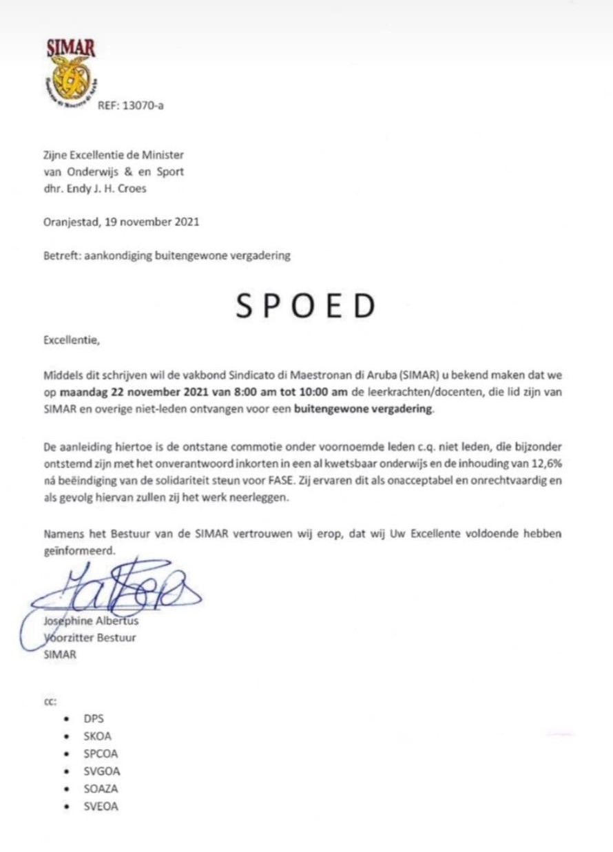 Den un carta, SIMAR ta informa Minister di Enseñansa Endy Croes di e reunion y cu esaki lo ta den cuadro di e discusion cu ta existi rond di e 12,6% di recorte di salario di e empleadonan publico.