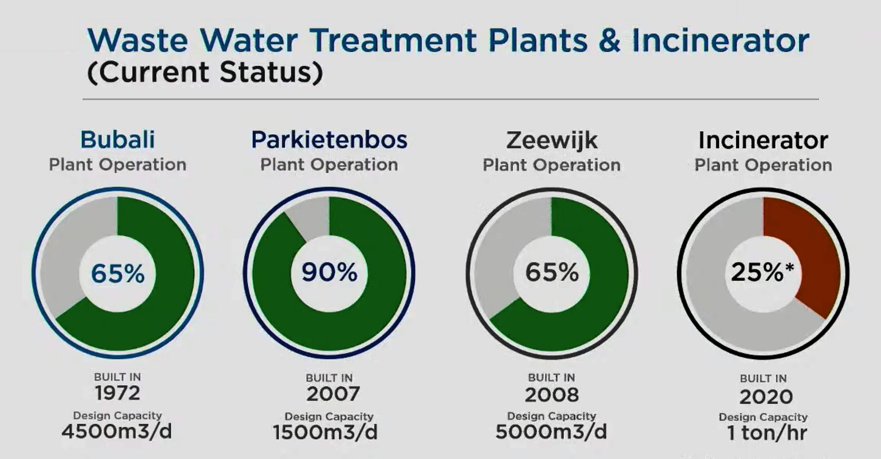 Na 2024, e situacion operacional tabata critico. E planta na Bubali tabata funciona na solamente 35% di su capacidad, Parkietenbos na 0%, Zeewijk na 65% y e incinerator na 25%. Awe, e resultadonan ta mustra progreso concreto: Bubali Plas ta opera na 65%, Parkietenbos na 90%, Zeewijk a keda stabiel na 65% y e incinerator ta sigui opera na 25%, mientras cu ta atende cu un acumulacion di desperdicio medico di mas cu un aña.