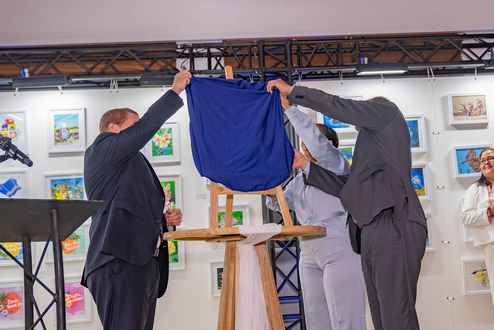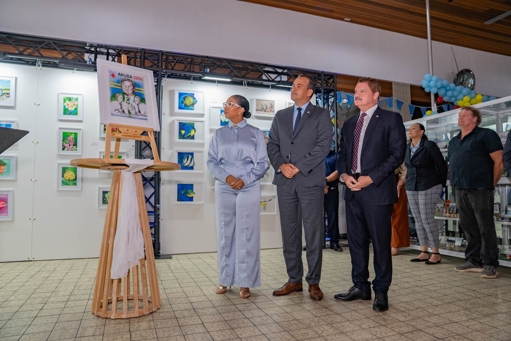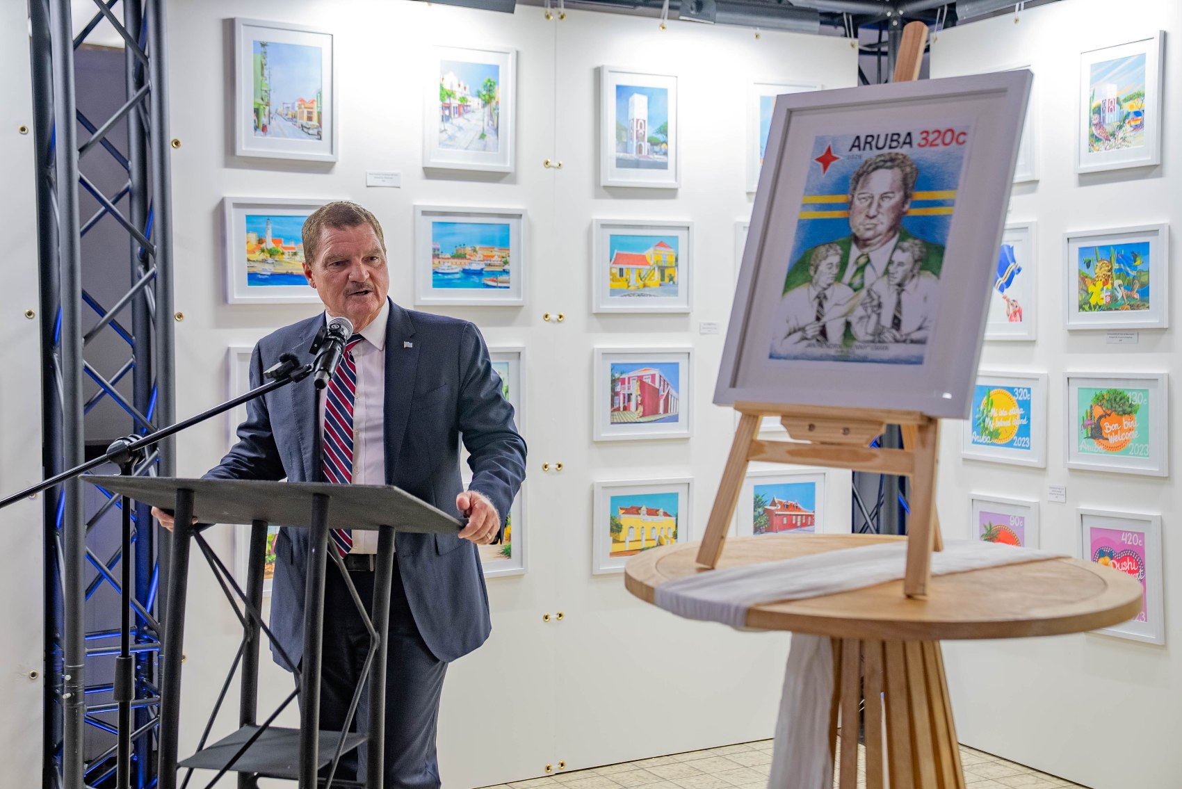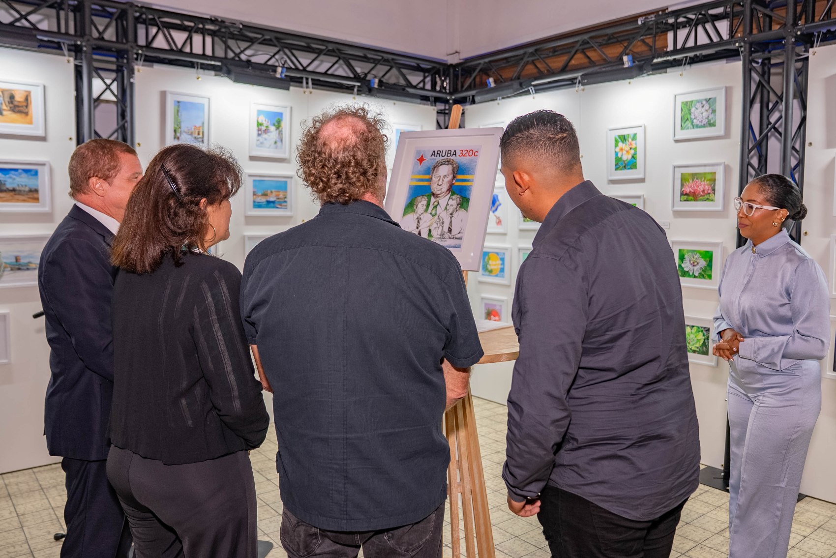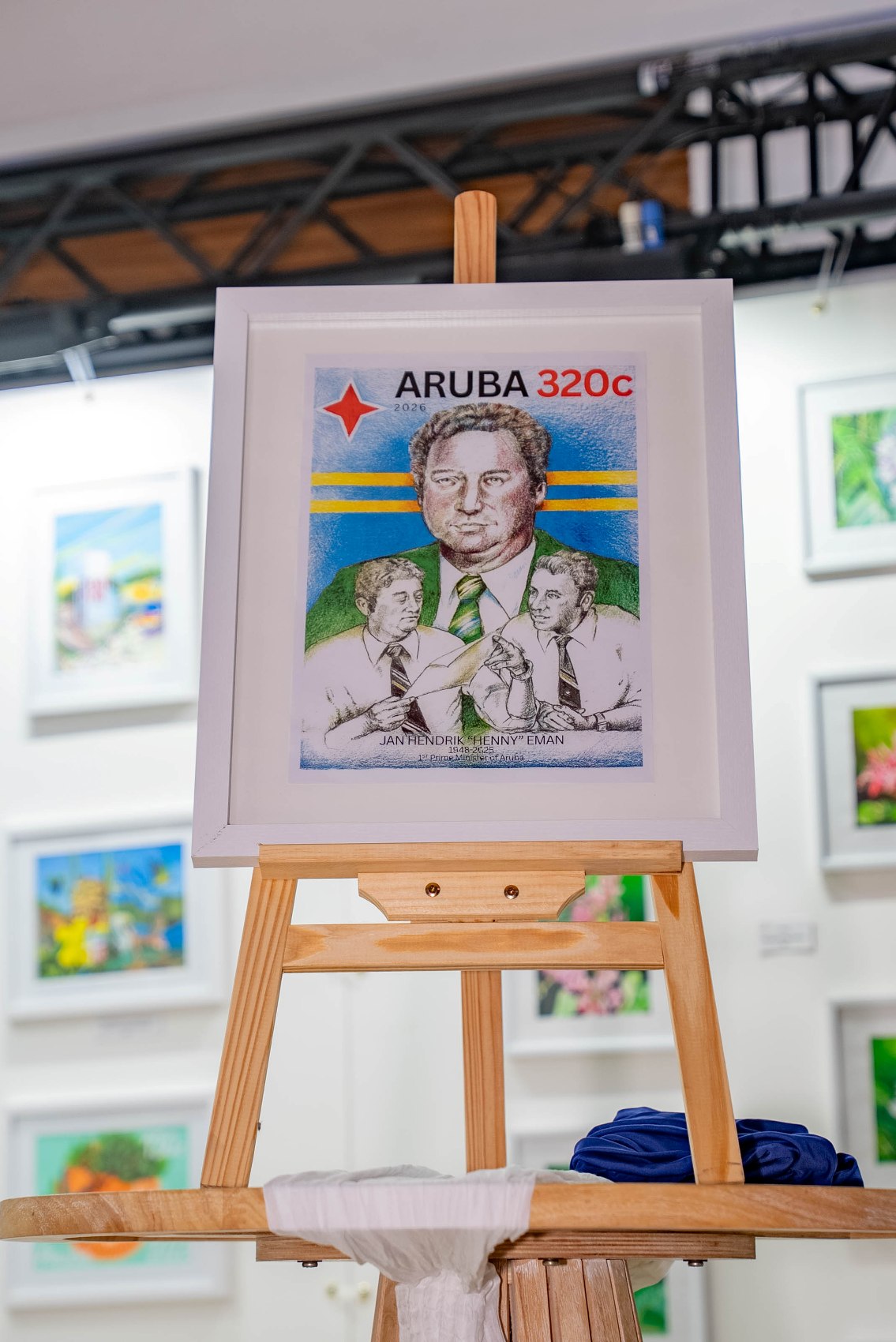 E diseño di e stambia, crea pa artista Nigel Matthews, cu a incorpora un retrato central di Henny Eman y elemento simbolico manera e bandera di Aruba, representando continuidad, liderazgo y identidad nacional.