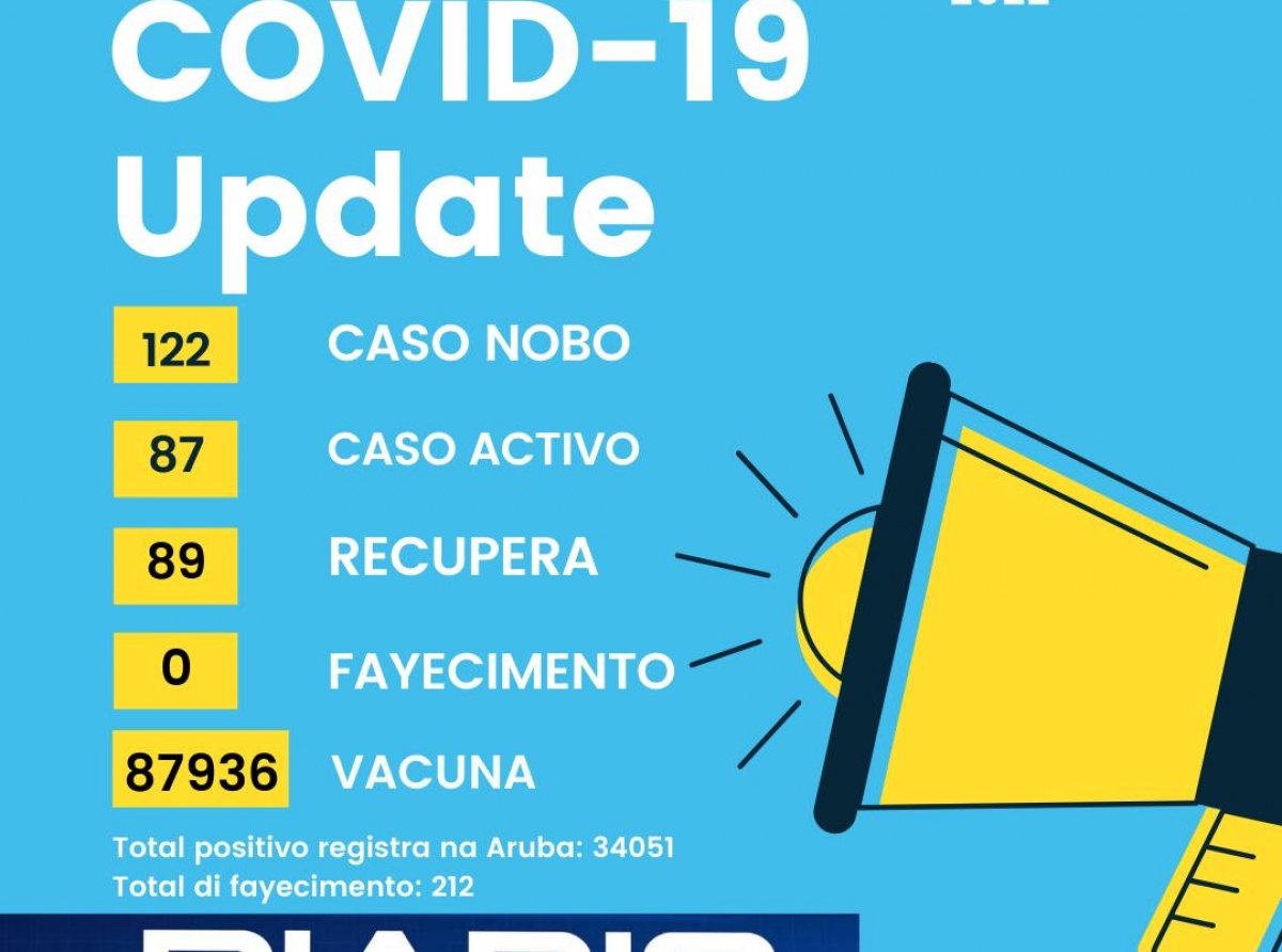 ORANJESTAD (AAN): Segun resumen semanal di diabierna 89 persona a recupera den e siman aki y un total di 122 caso nobo di COVID-19 a keda registra.
